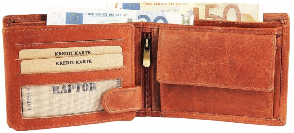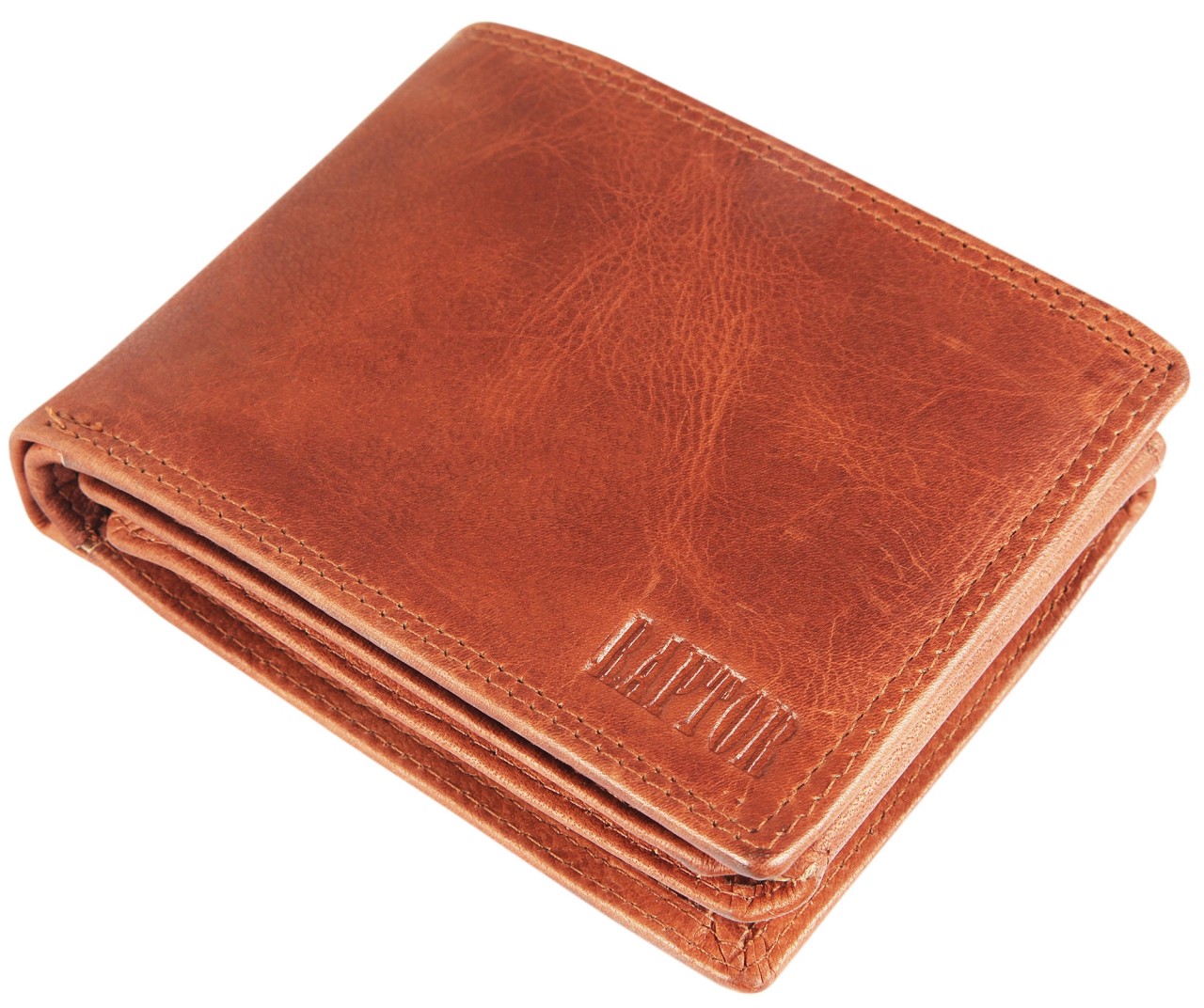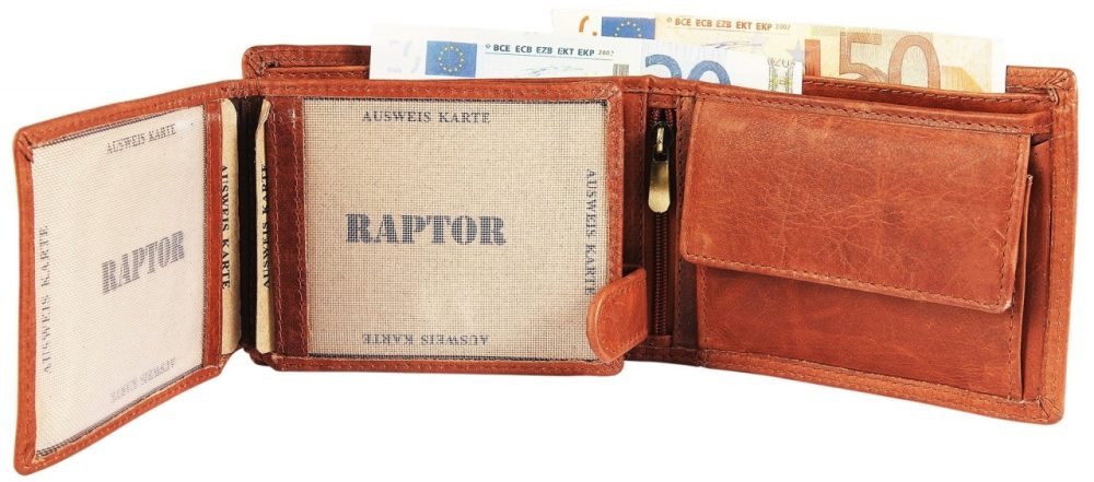 Carteira masculina Raptor confeccionada em couro genuíno. Tem 12 cm de largura e 9 cm de altura. Possui 2 compartimentos para notas, um compartimento para moedas, 10 compartimentos para cartões, um compartimento transparente para cartões de crédito e 2 compartimentos transparentes para identificação.