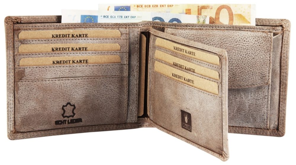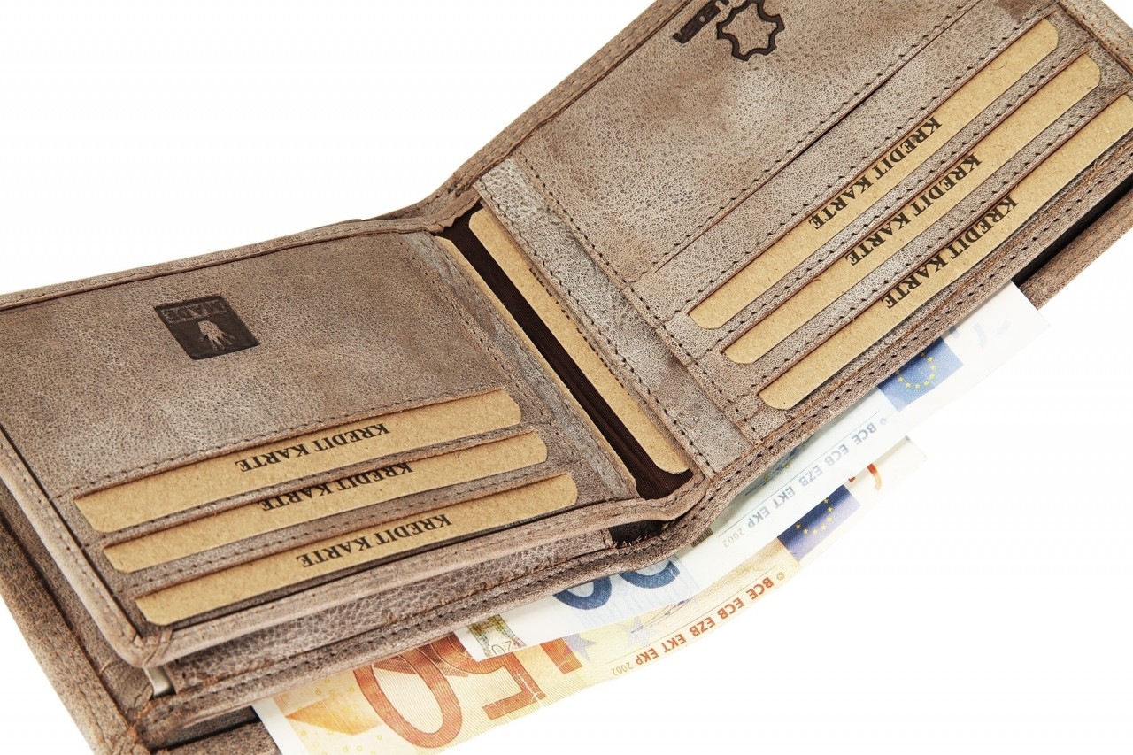Carteira masculina Raptor confeccionada em couro genuíno. Tem 12 cm de largura e 10 cm de altura. A cor é. Possui 2 compartimentos para notas, 1 compartimento para moedas, 7 compartimentos para cartões e um compartimento transparente para cartões de crédito.