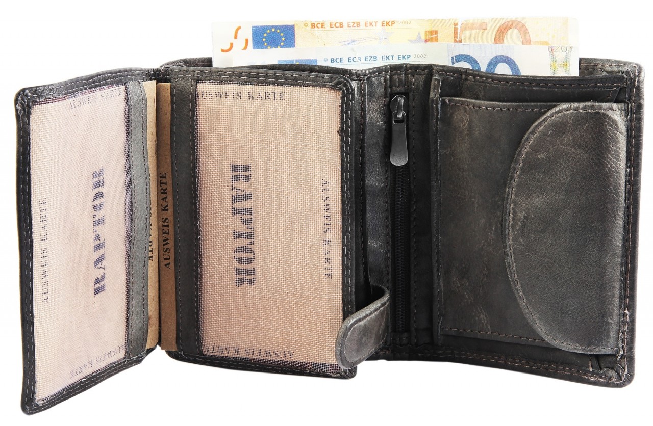 Carteira masculina Raptor confeccionada em couro genuíno. Tem 9 cm de largura e 2 cm de altura. Possui 2 compartimentos para notas, um compartimento para trocos, 9 compartimentos para cartões, 1 compartimento para moedas.