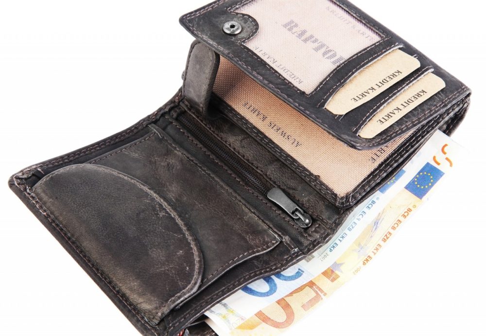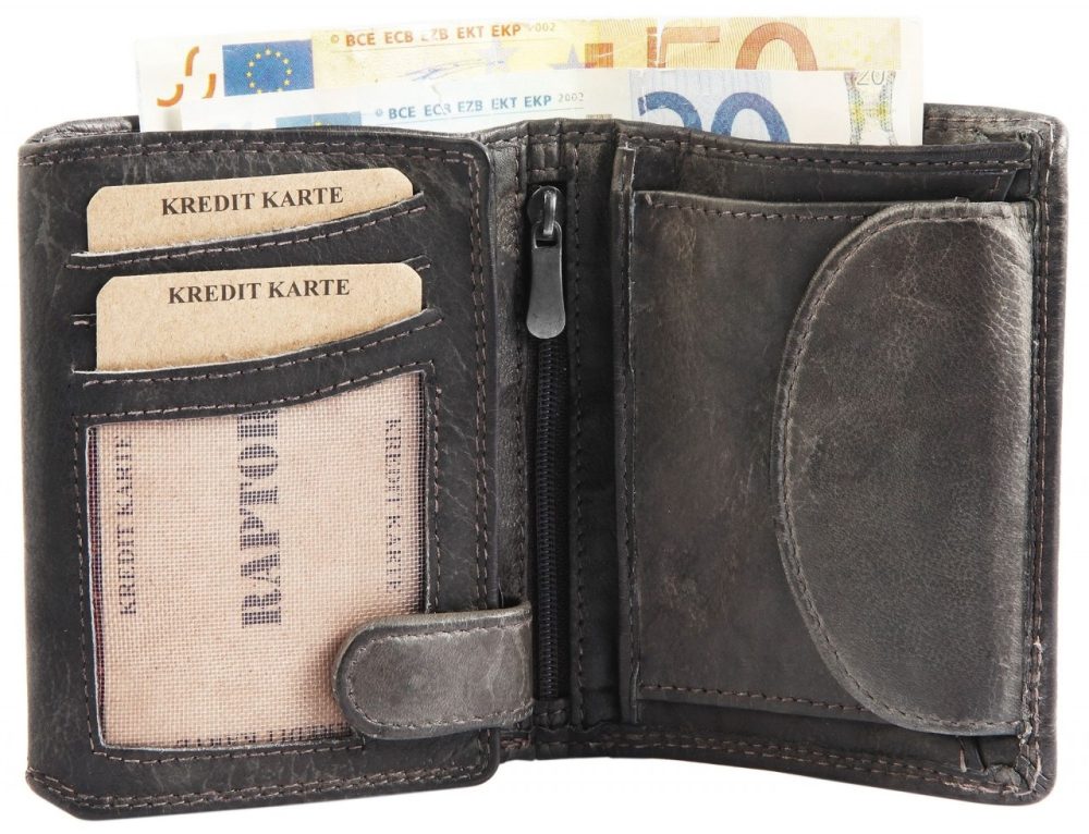 Carteira masculina Raptor confeccionada em couro genuíno. Tem 9 cm de largura e 2 cm de altura. Possui 2 compartimentos para notas, um compartimento para trocos, 9 compartimentos para cartões, 1 compartimento para moedas.