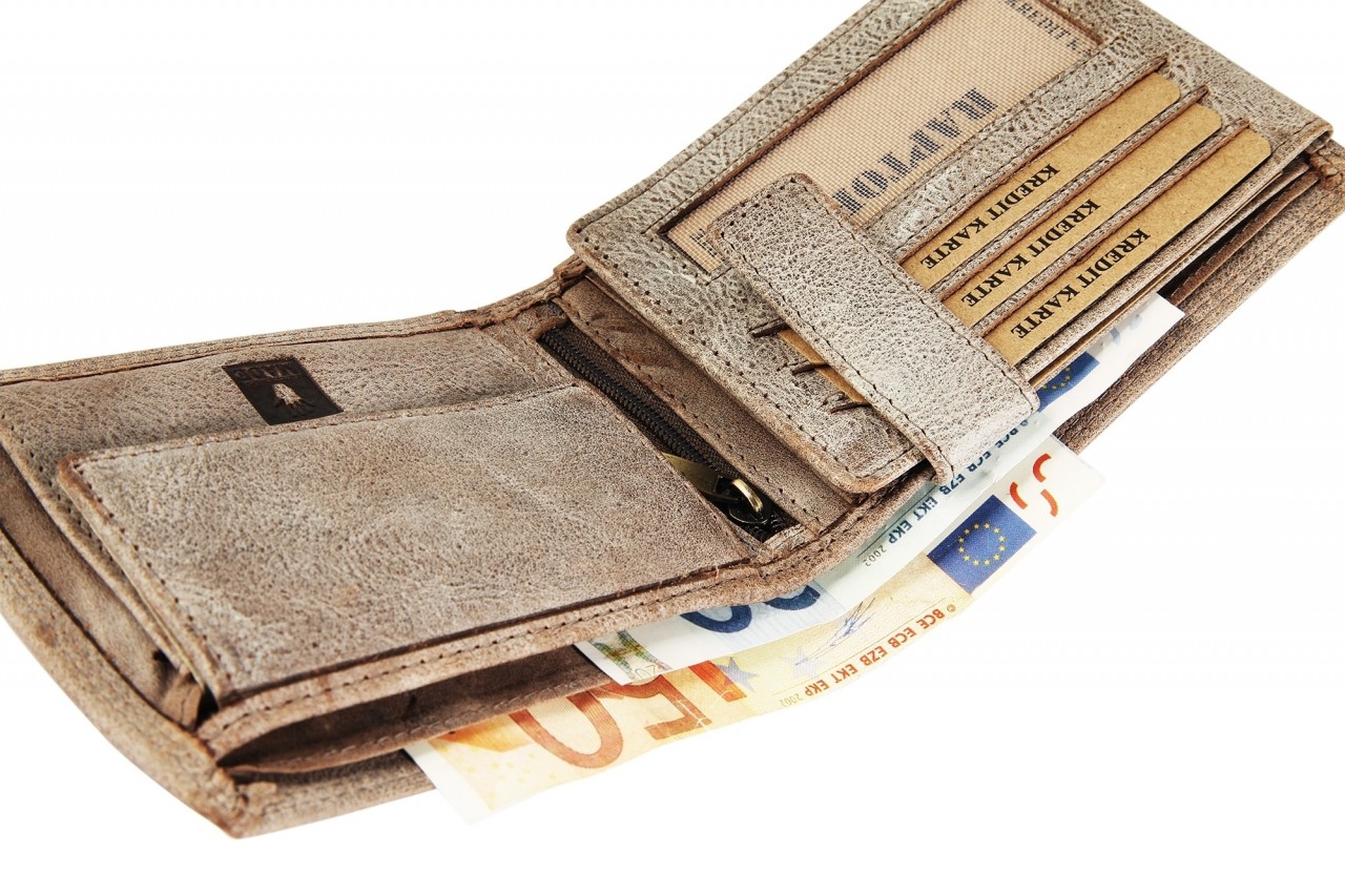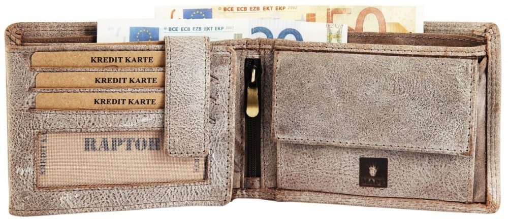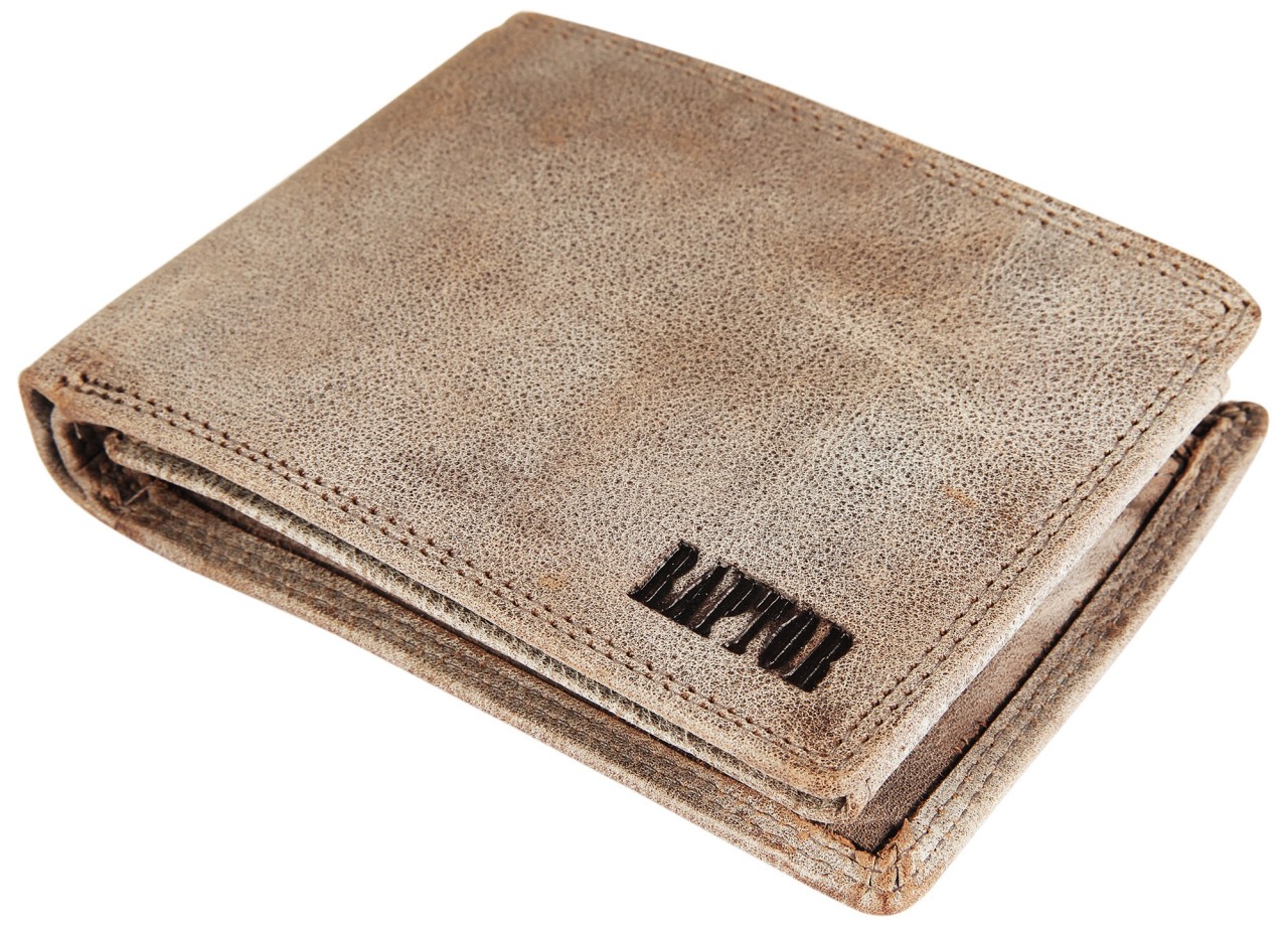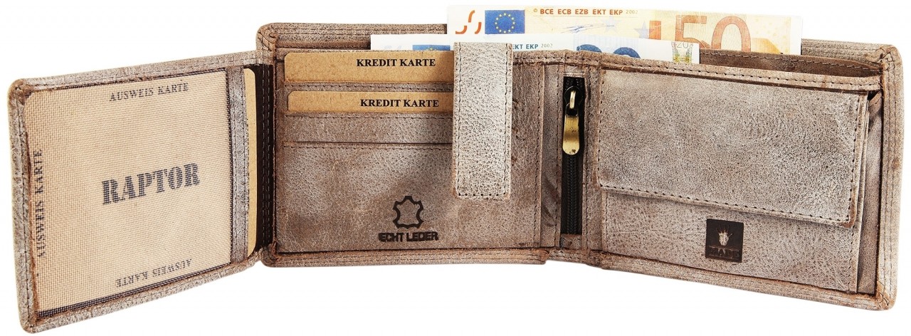 Carteira masculina Raptor confeccionada em couro genuíno. Tem 12 cm de largura e 9 cm de altura. Possui 2 compartimentos para notas, um compartimento para moedas, 7 compartimentos para cartões, um compartimento transparente para cartões de crédito e um compartimento transparente para identificação.
