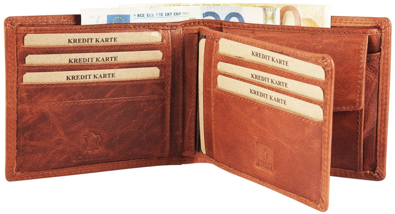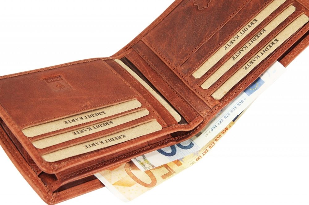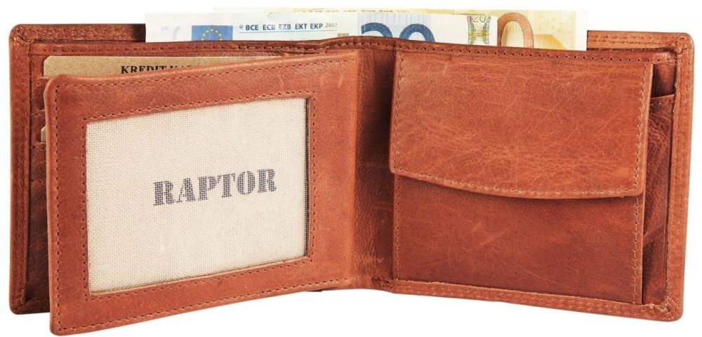 Carteira masculina Raptor confeccionada em couro genuíno. Tem 12 cm de largura e 10 cm de altura. Possui 2 compartimentos para notas, um compartimento para troco, 7 compartimentos para cartões e 1 compartimento transparente para cartões de crédito.
