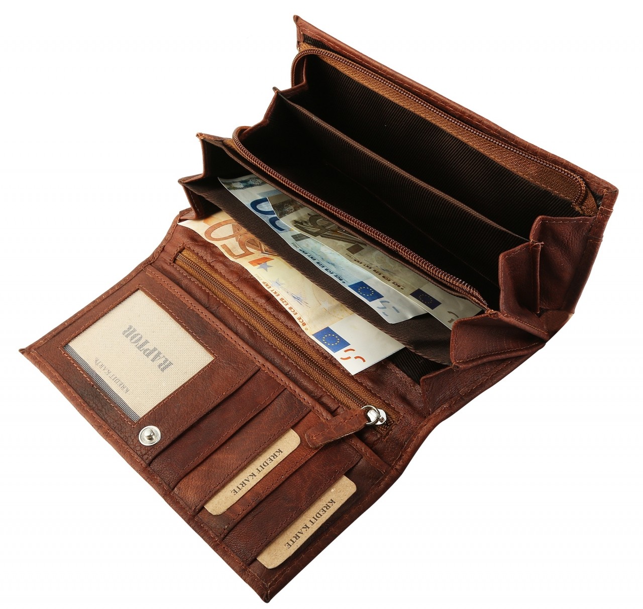 A carteira feminina da marca Raptor é confecionada em formato paisagem em couro genuíno e tem visual liso com sutis formações de grãos. As cores disponíveis são castanho, castanho escuro e preto. O design deu muita ênfase à individualidade, de modo que esta bolsa não é apenas uma ajudante prática do dia a dia, mas também uma companheira de moda. A carteira é um verdadeiro milagre de espaço e oferece muito espaço de armazenamento para todos os documentos importantes. Dessa forma, você pode manter todos os seus objetos de valor seguros e organizados enquanto estiver em trânsito e ter uma boa visão geral de todos os seus papéis. A carteira está dividida em 8 compartimentos para cartões de crédito, 2 compartimentos para notas, 1 compartimento grande para moedas com fecho, 1 compartimento com fecho e 1 compartimento transparente para cartões de crédito. A costura externa e interna da carteira garante boa durabilidade e estabilidade.