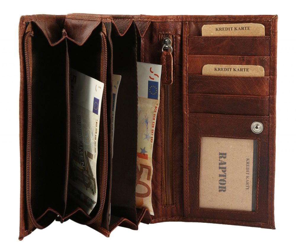 A carteira feminina da marca Raptor é confecionada em formato paisagem em couro genuíno e tem visual liso com sutis formações de grãos. As cores disponíveis são castanho, castanho escuro e preto. O design deu muita ênfase à individualidade, de modo que esta bolsa não é apenas uma ajudante prática do dia a dia, mas também uma companheira de moda. A carteira é um verdadeiro milagre de espaço e oferece muito espaço de armazenamento para todos os documentos importantes. Dessa forma, você pode manter todos os seus objetos de valor seguros e organizados enquanto estiver em trânsito e ter uma boa visão geral de todos os seus papéis. A carteira está dividida em 8 compartimentos para cartões de crédito, 2 compartimentos para notas, 1 compartimento grande para moedas com fecho, 1 compartimento com fecho e 1 compartimento transparente para cartões de crédito. A costura externa e interna da carteira garante boa durabilidade e estabilidade.