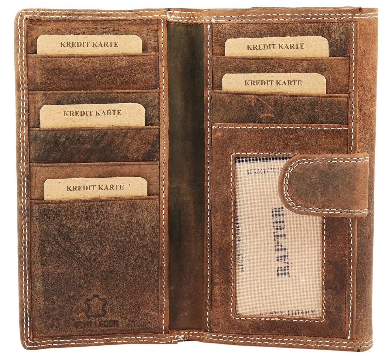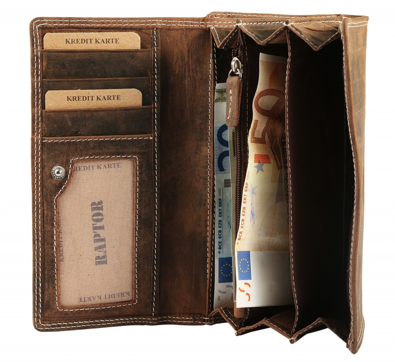 Carteira feminina Raptor confeccionada em couro genuíno. Tem 18 cm de largura e 10 cm de altura. A carteira de couro genuíno é fechada com fecho de pressão. Possui 7 compartimentos para notas, 1 compartimento para moedas, 10 compartimentos para cartões, 2 compartimentos transparentes.