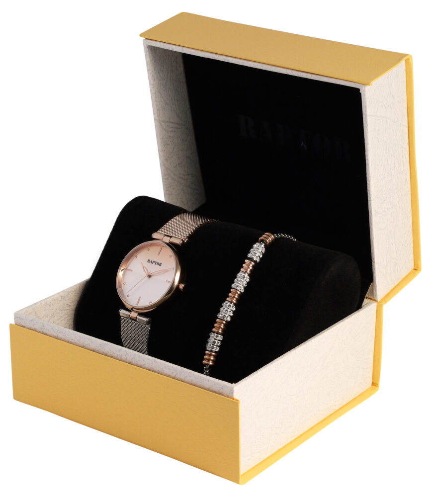 Conjunto Raptor para mulheres oferece a combinação ideal de um relógio elegante e uma joia.