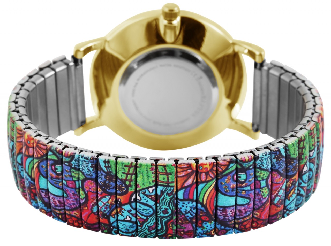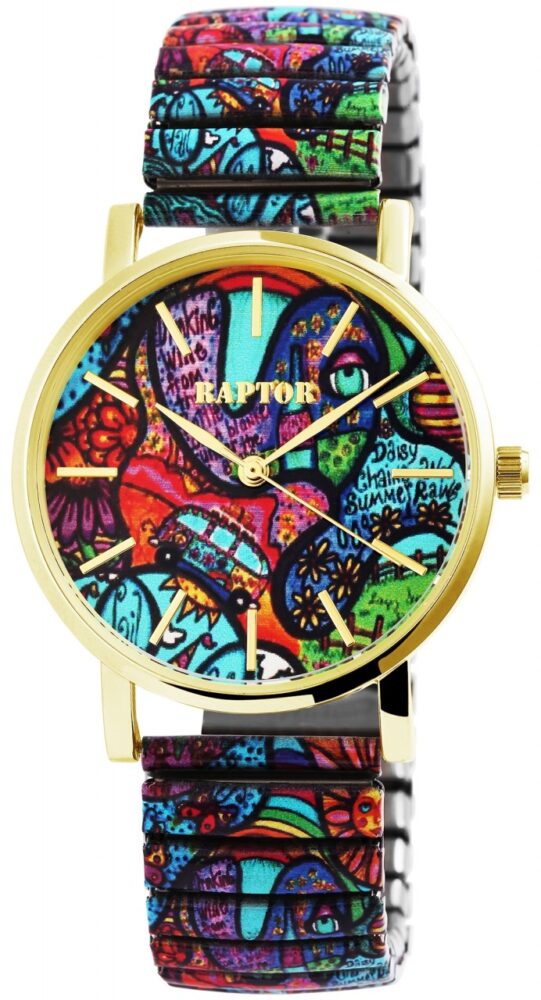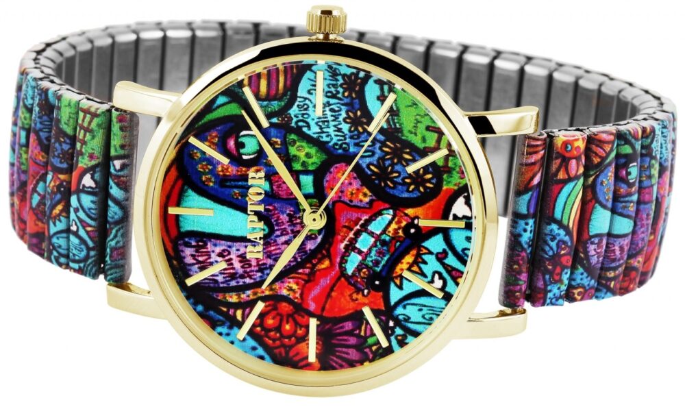 O relógio de pulso feminino analógico de 3 ponteiros da Raptor possui um movimento de quartzo de alta qualidade. A prática pulseira de aço inoxidável tem 18 mm de largura na extremidade e é particularmente fácil de puxar no pulso graças à pulseira flexível. Além disso, o relógio é muito confortável de usar devido à sua leveza e flexibilidade. O comprimento total do relógio é de 18,5 cm. O comprimento da pulseira pode ser ajustado para caber em qualquer pulso. Os elementos podem ser adicionados ou removidos. A caixa redonda de metal com vidro mineral tem um diâmetro de 36 mm e uma altura de 8 mm. O fundo da caixa é feito de aço inoxidável. Cada relógio de pulso é um destaque visual, porque o padrão colorido da pulseira se reflete no mostrador e torna o relógio moderno um atrativo completo.