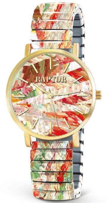 O relógio de pulso feminino analógico de 3 ponteiros da Raptor possui um movimento de quartzo de alta qualidade. A prática pulseira de aço inoxidável tem 18 mm de largura na extremidade e é particularmente fácil de puxar no pulso graças à pulseira flexível. Além disso, o relógio é muito confortável de usar devido à sua leveza e flexibilidade. O comprimento total do relógio é de 18,5 cm. O comprimento da pulseira pode ser ajustado para caber em qualquer pulso. Os elementos podem ser adicionados ou removidos. A caixa redonda de metal com vidro mineral tem um diâmetro de 36 mm e uma altura de 8 mm. O fundo da caixa é feito de aço inoxidável. Cada relógio de pulso é um destaque visual, porque o padrão colorido da pulseira se reflete no mostrador.