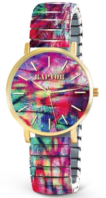 O relógio de pulso feminino analógico de 3 ponteiros da Raptor possui um movimento de quartzo de alta qualidade. A prática pulseira de aço inoxidável tem 18 mm de largura na extremidade e é particularmente fácil de puxar no pulso graças à pulseira flexível. Além disso, o relógio é muito confortável de usar devido à sua leveza e flexibilidade. O comprimento total do relógio é de 18,5 cm. O comprimento da pulseira pode ser ajustado para caber em qualquer pulso. Os elementos podem ser adicionados ou removidos. A caixa redonda de metal com vidro mineral tem um diâmetro de 36 mm e uma altura de 8 mm. O fundo da caixa é feito de aço inoxidável. Cada relógio de pulso é um destaque visual, porque o padrão colorido da pulseira se reflete no mostrador.