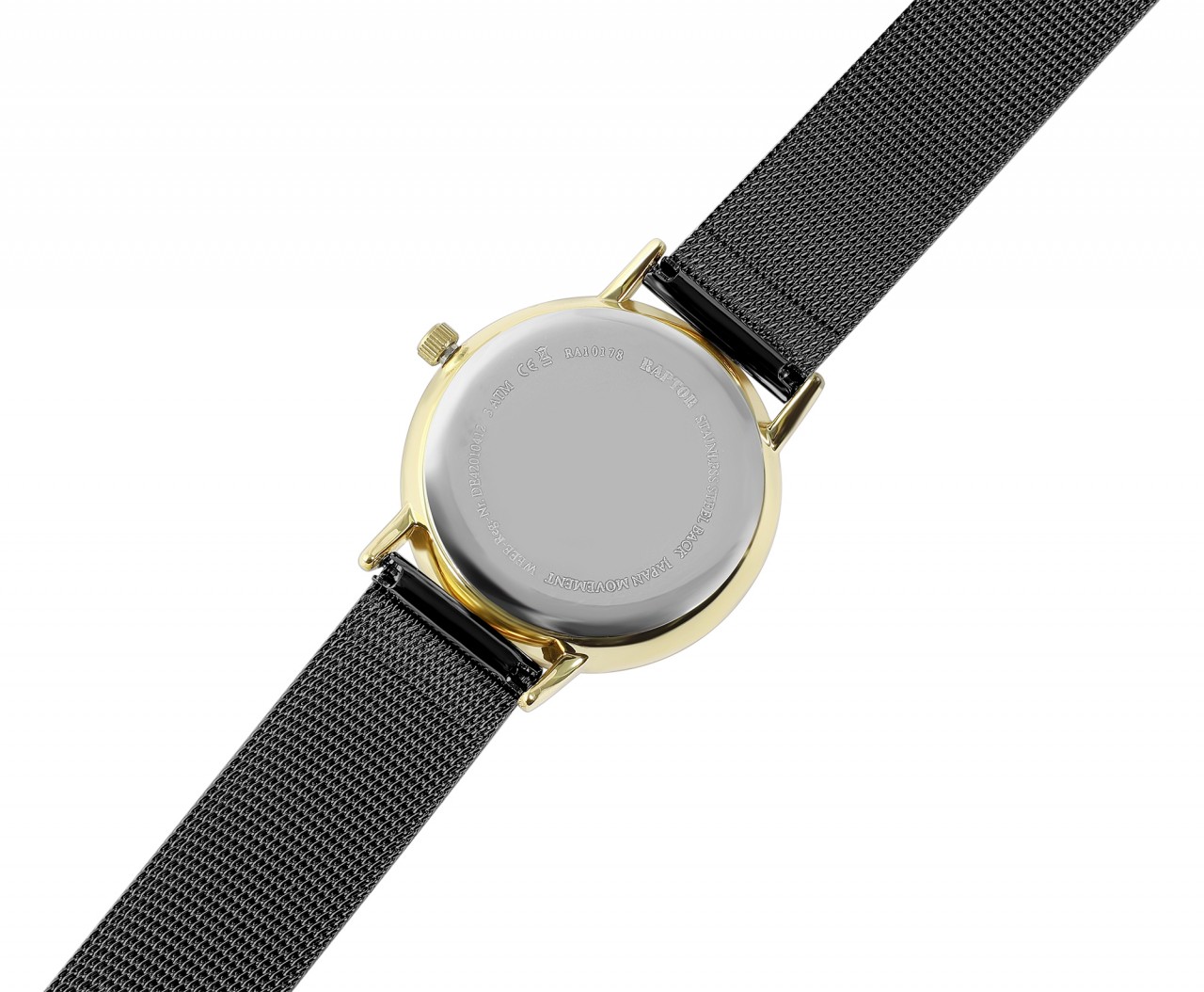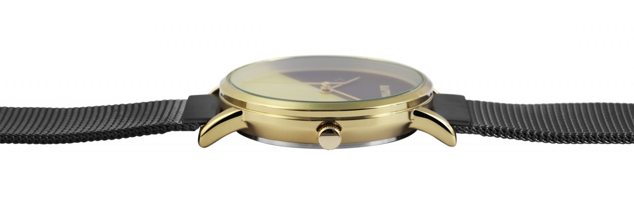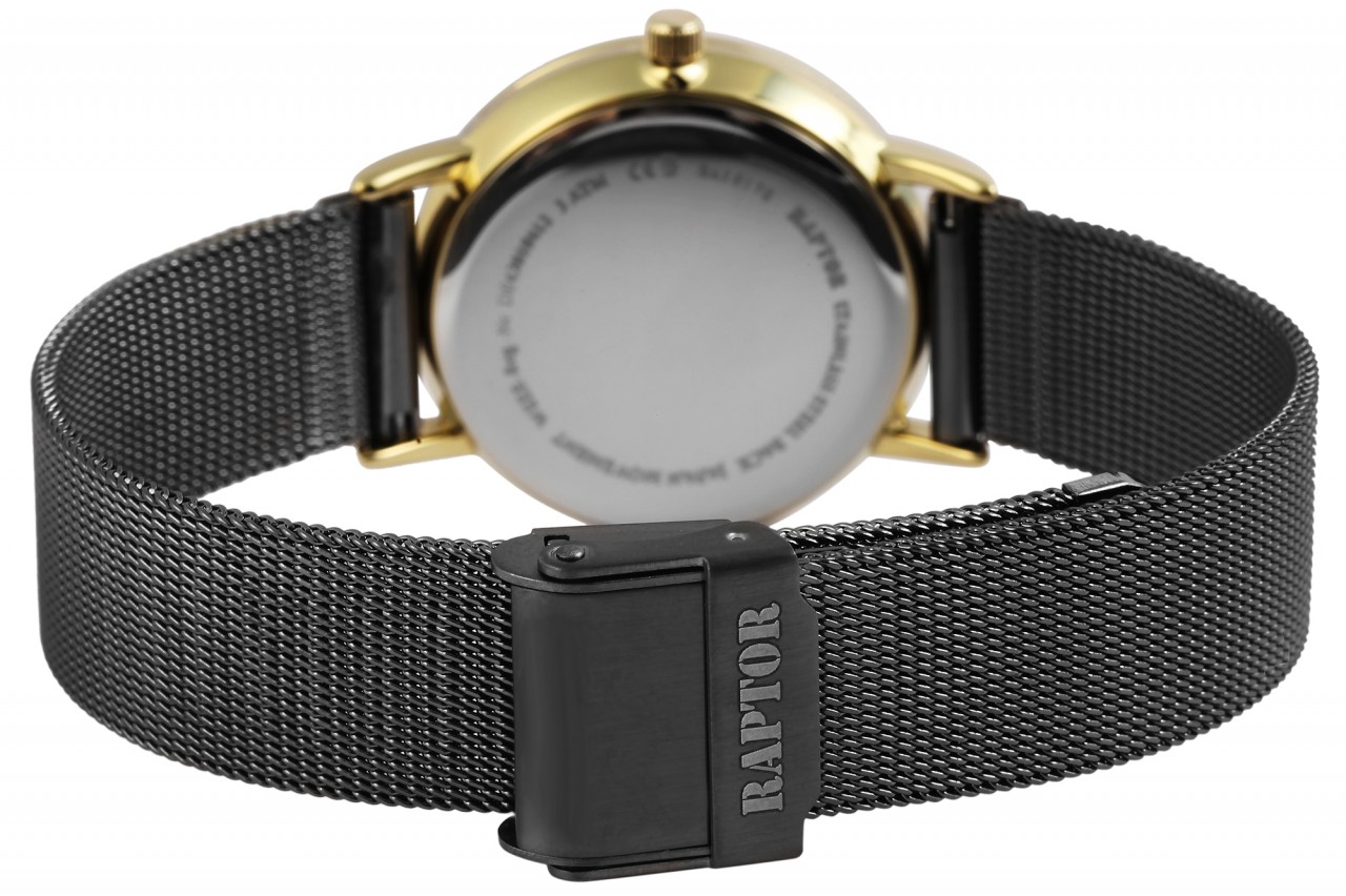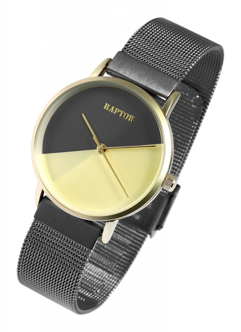 O relógio de pulso analógico de 3 ponteiros para senhora da marca Raptor possui um movimento de quartzo de alta qualidade. A bracelete milanesa é feita de aço inoxidável e tem uma largura de 16 mm. O relógio de 23 cm de comprimento pode ser aberto e fechado com um fecho de gancho em aço inoxidável. A caixa metálica com vidro mineral tem um diâmetro de 32 mm e uma altura de 8 mm. O fundo da caixa é feito de aço inoxidável e o relógio tem uma resistência à água de 3 bar. Um destaque visual é o mostrador, que está dividido em duas metades de cores diferentes por uma linha diagonal. Também não existem números no mostrador. Estas características especiais fazem deste relógio de pulso da moda um objeto absolutamente indispensável. Os ponteiros são da mesma cor que a caixa e completam o aspeto geral harmonioso do relógio.