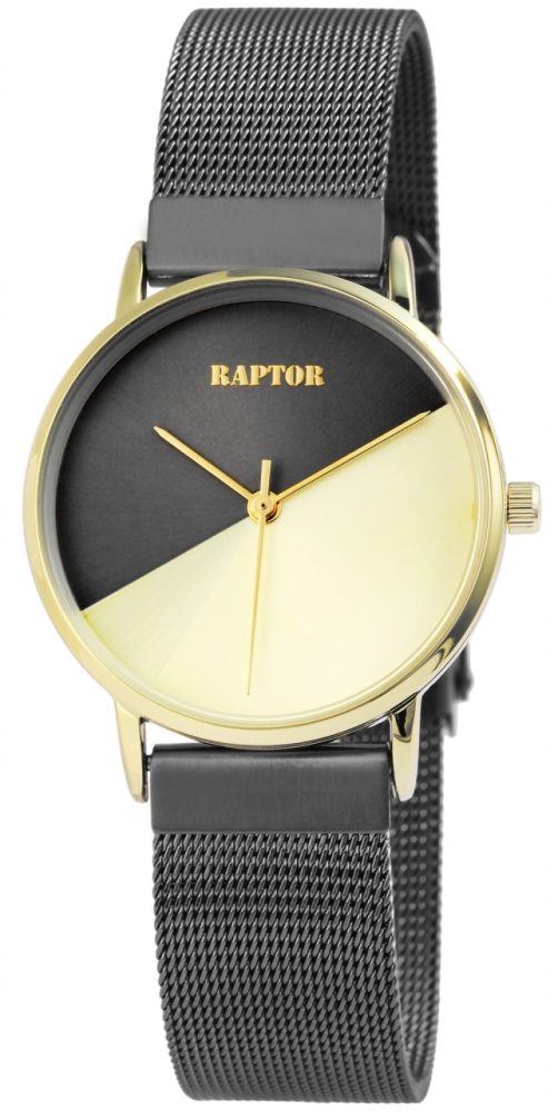 O relógio de pulso analógico de 3 ponteiros para senhora da marca Raptor possui um movimento de quartzo de alta qualidade. A bracelete milanesa é feita de aço inoxidável e tem uma largura de 16 mm. O relógio de 23 cm de comprimento pode ser aberto e fechado com um fecho de gancho em aço inoxidável. A caixa metálica com vidro mineral tem um diâmetro de 32 mm e uma altura de 8 mm. O fundo da caixa é feito de aço inoxidável e o relógio tem uma resistência à água de 3 bar. Um destaque visual é o mostrador, que está dividido em duas metades de cores diferentes por uma linha diagonal. Também não existem números no mostrador. Estas características especiais fazem deste relógio de pulso da moda um objeto absolutamente indispensável. Os ponteiros são da mesma cor que a caixa e completam o aspeto geral harmonioso do relógio.