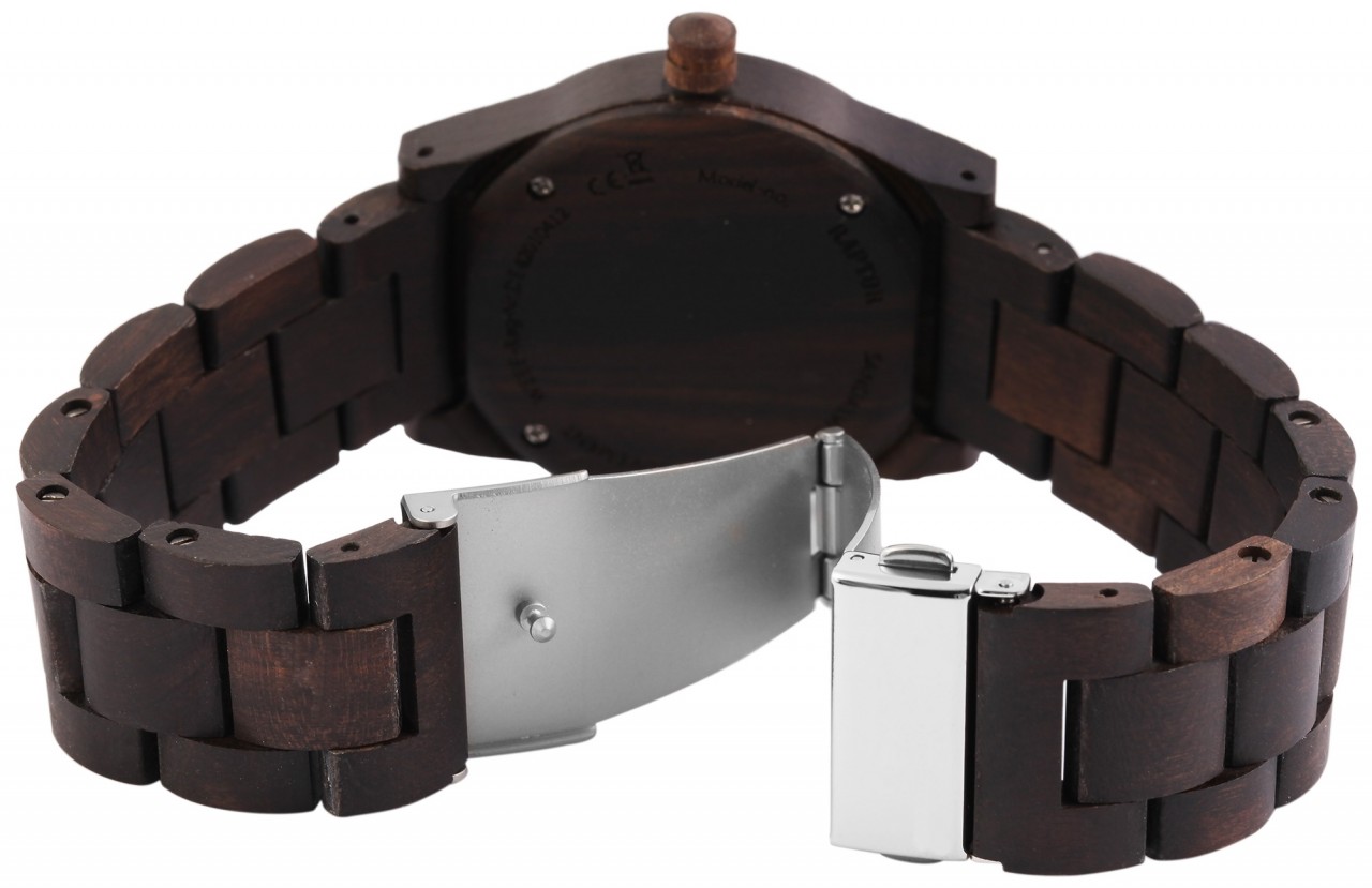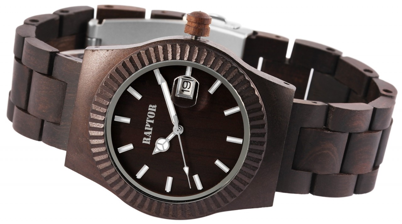 O relógio de senhora analógico da marca Raptor tem um Miyota 2115 e a designação do modelo é RA092. A bracelete em madeira tem 20 mm de largura e abre-se com um fecho desdobrável em aço inoxidável. O comprimento total é de 20 cm. A caixa de madeira com vidro mineral mede 41 mm e tem 12 mm de altura. A tampa da caixa é feita de madeira. O relógio Raptor para homem tem as seguintes características: Indicação da data. Receberá os seguintes acessórios com o seu produto: cartão de garantia, caixa original e manual de instruções.
