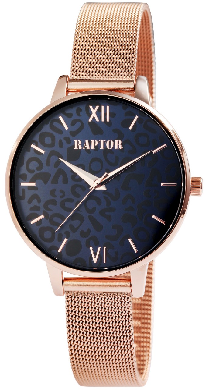 O relógio de pulso feminino analógico de 3 ponteiros da marca Raptor possui um movimento de quartzo de alta qualidade. A pulseira milanesa de malha fina é feita de aço inoxidável, tem 14 mm de largura nas alças e garante conforto no seu uso. Devido ao fecho de gancho ajustável com barra de segurança, o comprimento do relógio pode ser ajustado individualmente a qualquer pulso. O comprimento total é de 23 cm. A caixa de metal com vidro mineral tem um diâmetro de 38 mm e uma altura de 8 mm. Neste modelo de relógio, o foco está no mostrador, que é desenhado com uma moderna estampa de leopardo. Isso habilmente se destaca e atrai inúmeros olhares. A divisão do mostrador é simples, os ponteiros e os índices combinam com a cor da caixa e, assim, completam harmoniosamente o quadro geral.