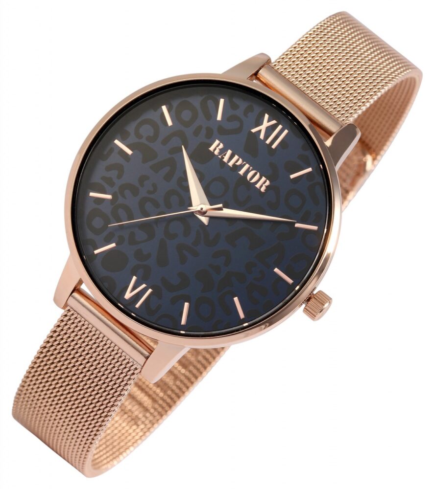O relógio de pulso feminino analógico de 3 ponteiros da marca Raptor possui um movimento de quartzo de alta qualidade. A pulseira milanesa de malha fina é feita de aço inoxidável, tem 14 mm de largura nas alças e garante conforto no seu uso. Devido ao fecho de gancho ajustável com barra de segurança, o comprimento do relógio pode ser ajustado individualmente a qualquer pulso. O comprimento total é de 23 cm. A caixa de metal com vidro mineral tem um diâmetro de 38 mm e uma altura de 8 mm. Neste modelo de relógio, o foco está no mostrador, que é desenhado com uma moderna estampa de leopardo. Isso habilmente se destaca e atrai inúmeros olhares. A divisão do mostrador é simples, os ponteiros e os índices combinam com a cor da caixa e, assim, completam harmoniosamente o quadro geral.