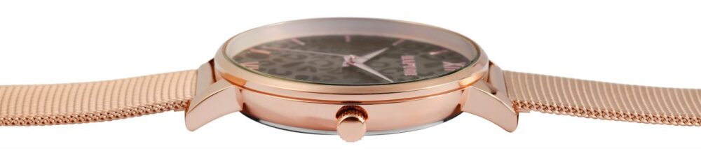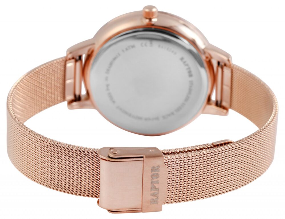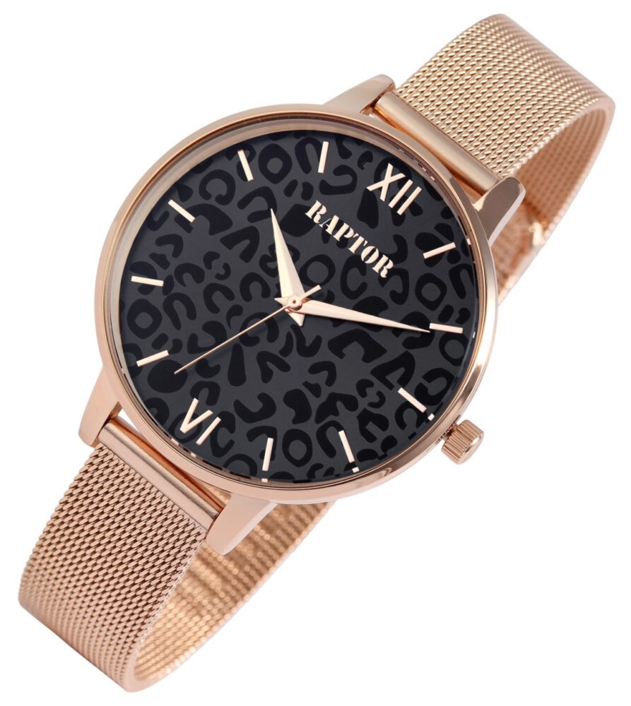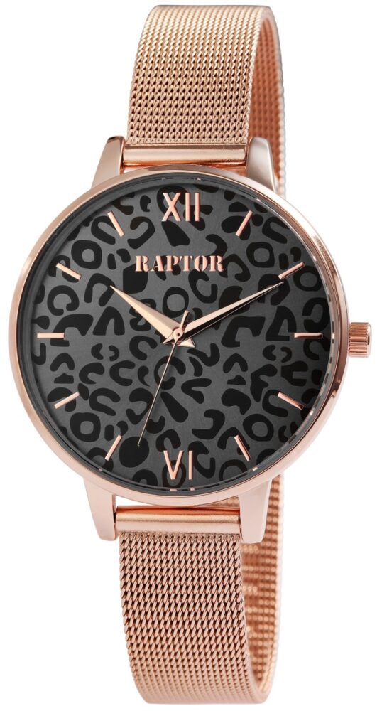 O relógio de pulso feminino analógico de 3 ponteiros da marca Raptor possui um movimento de quartzo de alta qualidade. A pulseira milanesa de malha fina é feita de aço inoxidável, tem 14 mm de largura nas alças e garante conforto no seu uso. Devido ao fecho de gancho ajustável com barra de segurança, o comprimento do relógio pode ser ajustado individualmente a qualquer pulso. O comprimento total é de 23 cm. A caixa de metal com vidro mineral tem um diâmetro de 38 mm e uma altura de 8 mm. Neste modelo de relógio, o foco está no mostrador, que é desenhado com uma moderna estampa de leopardo. Isso habilmente se destaca e atrai inúmeros olhares. A divisão do mostrador é simples, os ponteiros e os índices combinam com a cor da caixa e, assim, completam harmoniosamente o quadro geral.