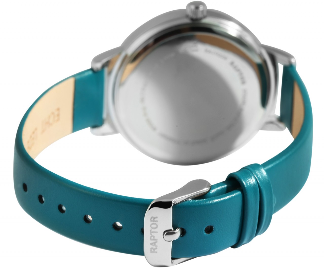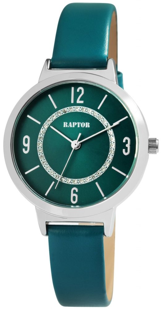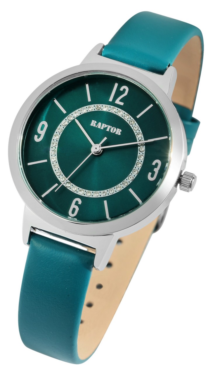 O relógio de pulso analógico de 3 ponteiros para senhora da marca Raptor apresenta o movimento de quartzo Miyota 2035 de alta qualidade e precisão. A bracelete em pele tem 14 mm de largura na extremidade e afunila 2 mm para que a extremidade do fecho tenha 12 mm. O elegante relógio pode ser aberto e fechado com uma fivela de pino. O comprimento total é de 24 cm. A caixa metálica com vidro mineral tem um diâmetro de 36 mm e uma altura de 9 mm. O fundo da caixa é feito de aço inoxidável. O mostrador é um destaque visual, com o anel do mostrador decorado com pedras cintilantes Similis. A interação entre o mostrador e a bracelete, que brilham na mesma cor, fazem do relógio um acessório de sucesso para o dia a dia e para ocasiões especiais. A caixa do relógio, os ponteiros e os índices também são da mesma cor e completam o design na perfeição.