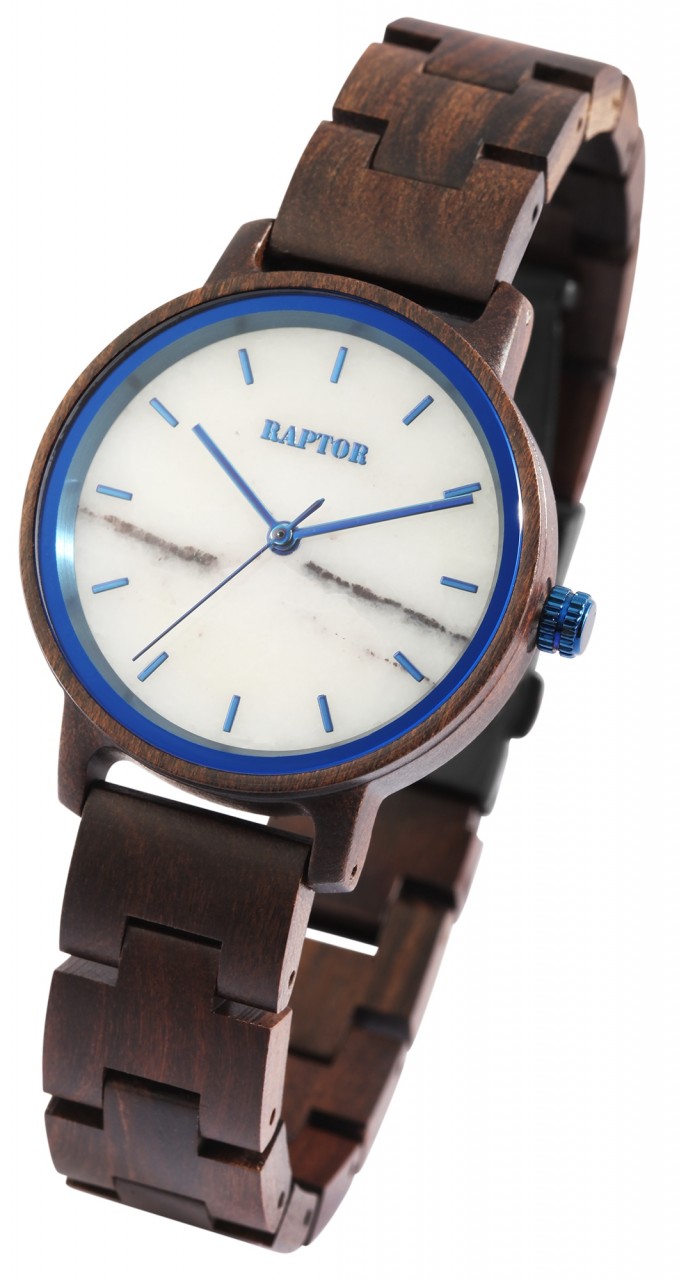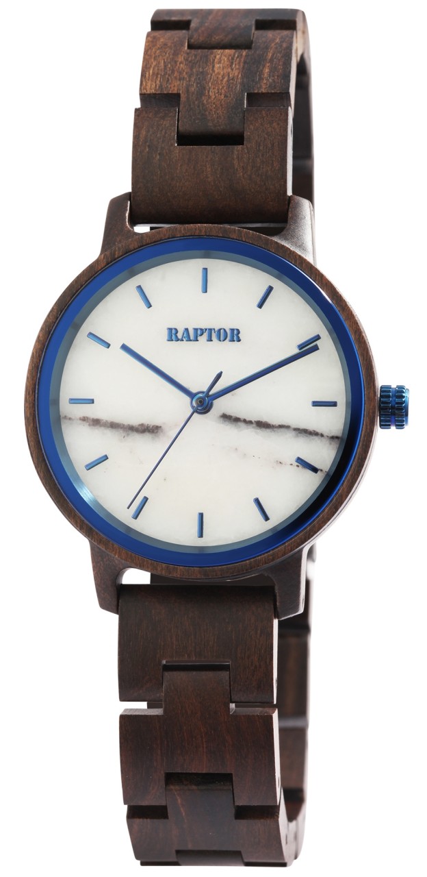 O relógio de pulso feminino analógico de 3 ponteiros da marca Raptor possui o movimento de quartzo Miyota GL30 de alta qualidade. A pulseira de madeira tem 16 mm de largura na alça e pode ser aberta e fechada com um fecho dobrável em aço inoxidável. O comprimento total do relógio é de 22 cm. A caixa de madeira com vidro mineral tem um diâmetro de 36 mm e uma altura de 11 mm. O fundo da caixa também é feito de madeira. Um destaque visual é a borda espelhada de 1 mm de largura no vidro mineral. Os ponteiros são feitos na mesma cor da borda do espelho e juntos conferem ao relógio um visual especial e elegante. Com o relógio de madeira Raptor você tem um atrativo absoluto em seu pulso que pode ser combinado para qualquer ocasião. Graças ao material leve, adapta-se perfeitamente ao pulso para que você obtenha um conforto de uso fantástico.