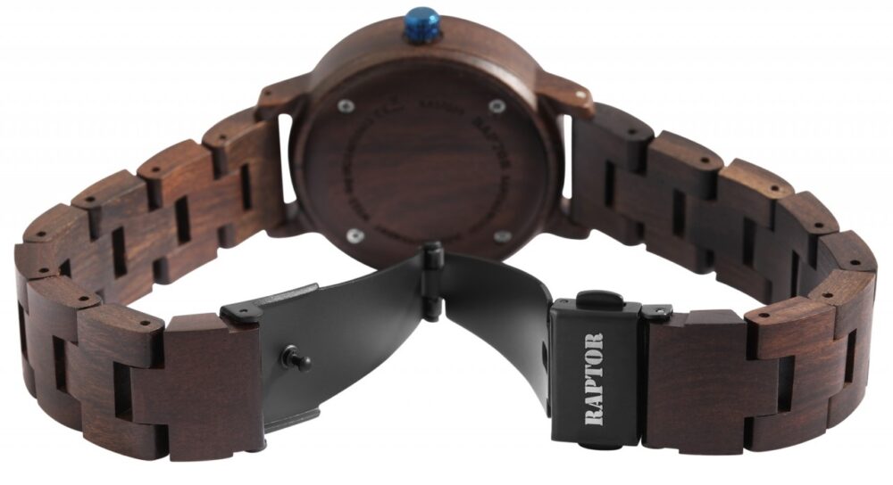 O relógio de pulso feminino analógico de 3 ponteiros da marca Raptor possui o movimento de quartzo Miyota GL30 de alta qualidade. A pulseira de madeira tem 16 mm de largura na alça e pode ser aberta e fechada com um fecho dobrável em aço inoxidável. O comprimento total do relógio é de 22 cm. A caixa de madeira com vidro mineral tem um diâmetro de 36 mm e uma altura de 11 mm. O fundo da caixa também é feito de madeira. Um destaque visual é a borda espelhada de 1 mm de largura no vidro mineral. Os ponteiros são feitos na mesma cor da borda do espelho e juntos conferem ao relógio um visual especial e elegante. Com o relógio de madeira Raptor você tem um atrativo absoluto em seu pulso que pode ser combinado para qualquer ocasião. Graças ao material leve, adapta-se perfeitamente ao pulso para que você obtenha um conforto de uso fantástico.