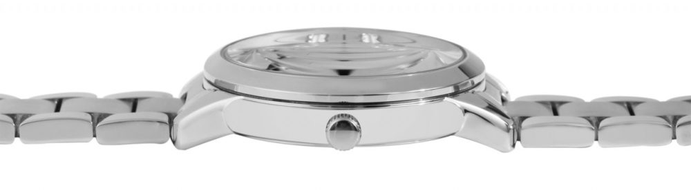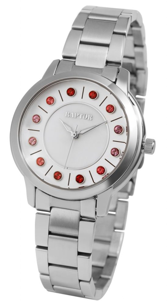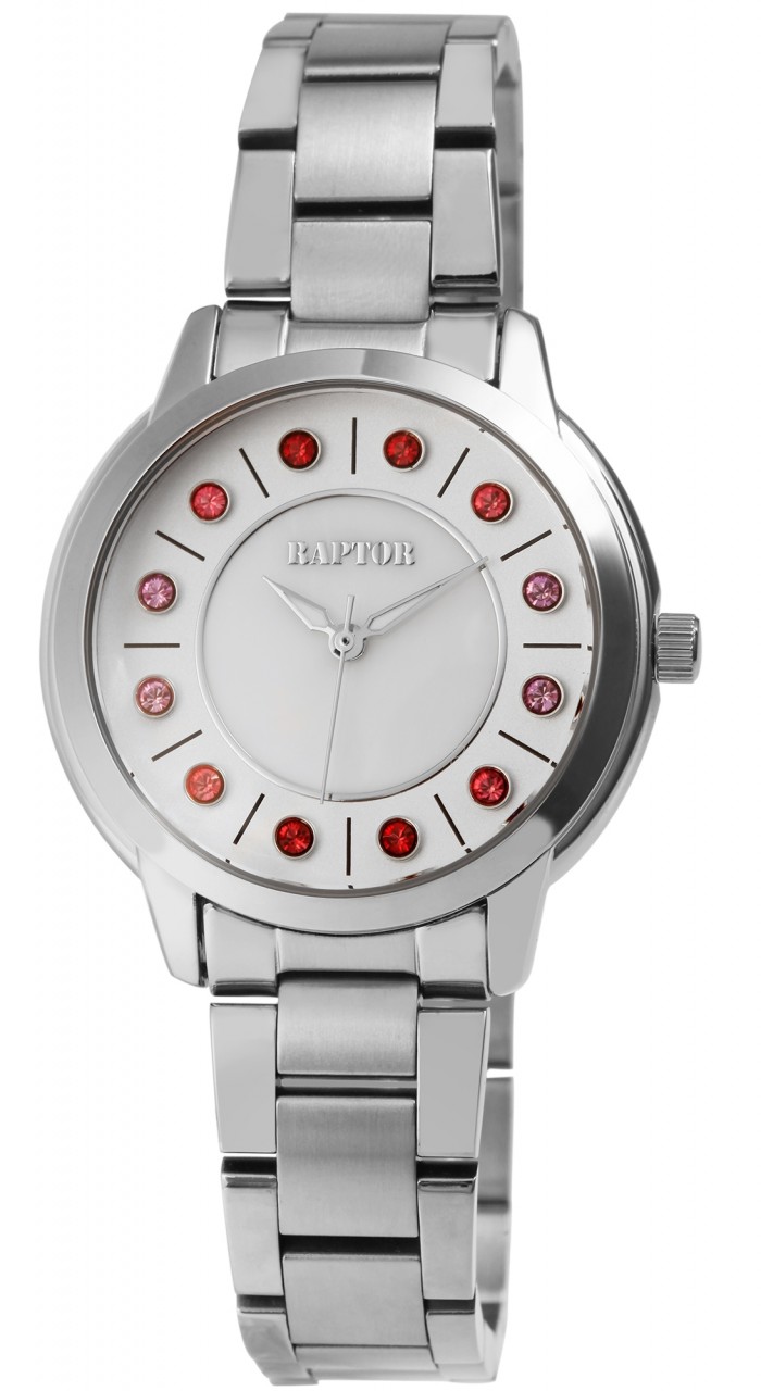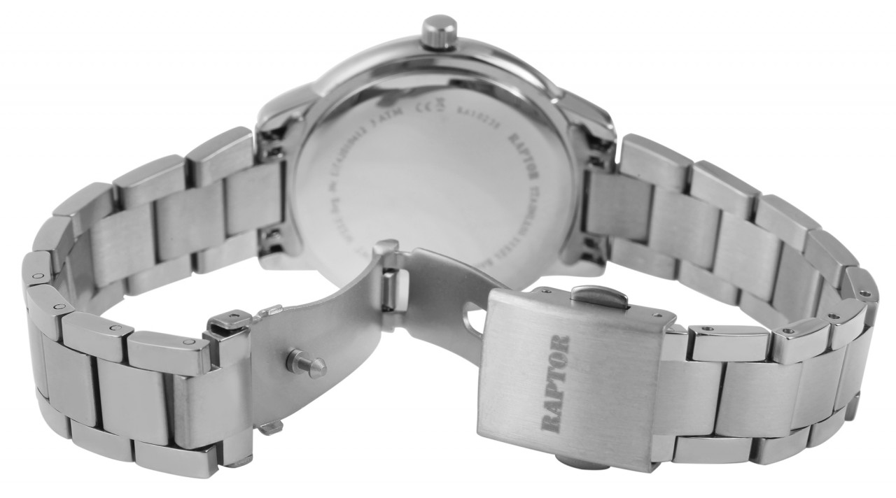O relógio de pulso analógico de 3 ponteiros para senhora da marca Raptor possui um movimento de quartzo de alta qualidade. A bracelete em aço inoxidável tem 16 mm de largura na extremidade e pode ser aberta e fechada com um fecho desdobrável. O comprimento total do relógio é de 20,5 cm, mas pode ser ajustado conforme necessário graças aos elementos amovíveis. O diâmetro da caixa é de 35 mm e a altura da caixa é de 9,5 mm. A tampa da caixa também é feita de aço inoxidável. O relógio possui igualmente uma resistência à água de 3 bar. O foco deste relógio de senhora está no mostrador. Este é decorado com pedras Similis cintilantes que servem de índices de pontos. A madrepérola brilha em todas as suas facetas no anel interior do mostrador. A bracelete em aço inoxidável brilhante forma uma transição tranquila para a caixa do relógio e completa o visual geral.