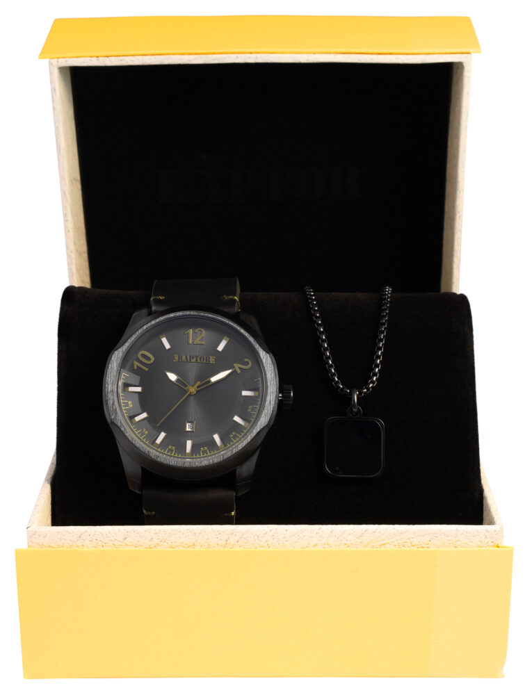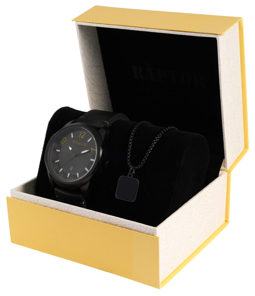 Conjunto Raptor para Homens oferece a combinação perfeita de um relógio marcante e um colar que harmoniza perfeitamente