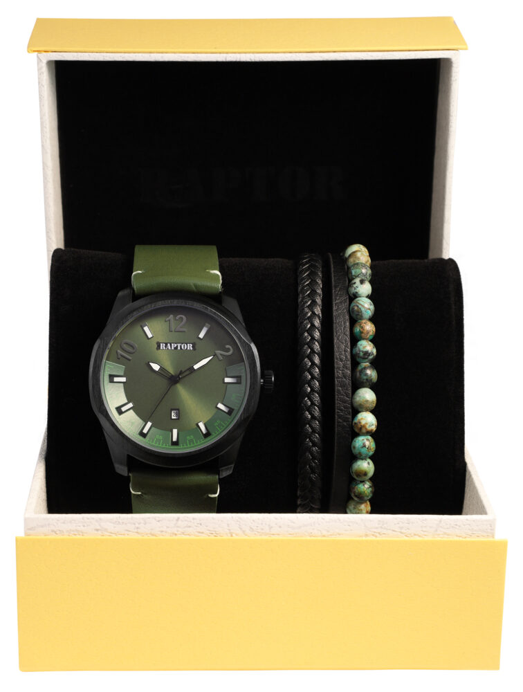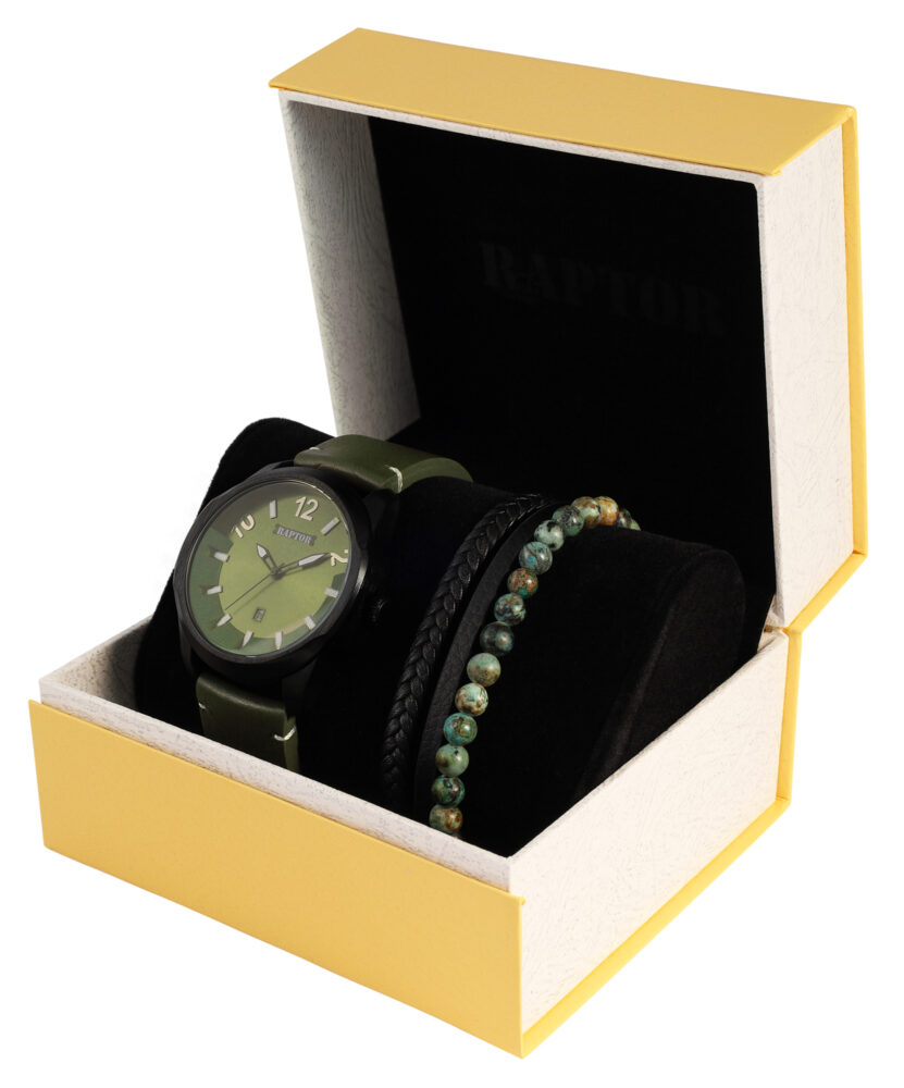 Conjunto Raptor para homem oferece a combinação ideal de um relógio elegante e uma joia.