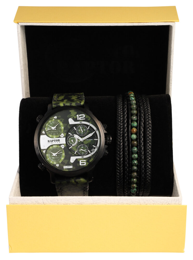 Conjunto Raptor para homens oferece a combinação ideal de um relógio e uma joia.