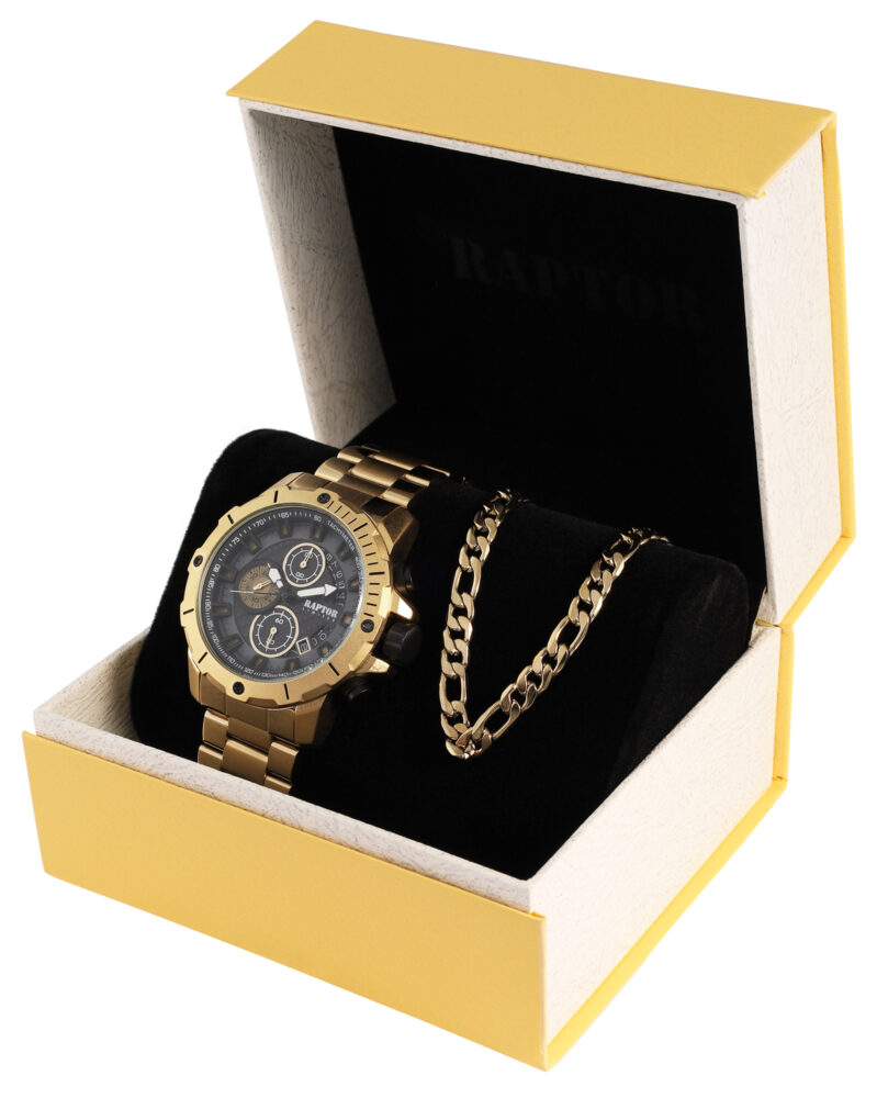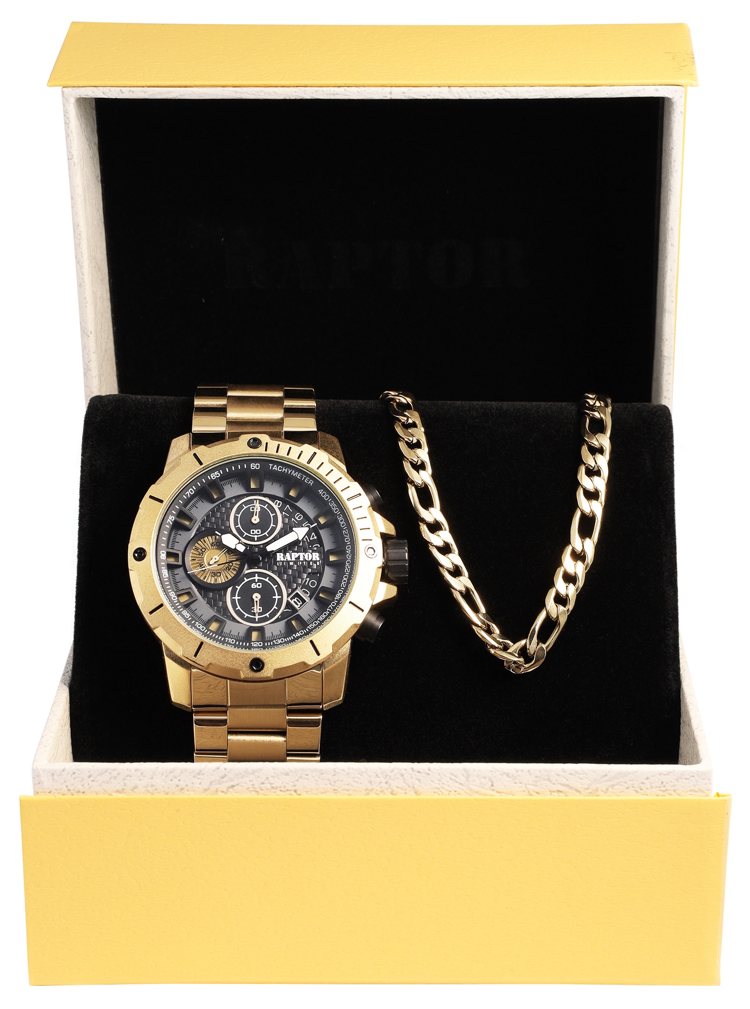 Conjunto Raptor para homem oferece a combinação ideal de um relógio elegante e uma joia.