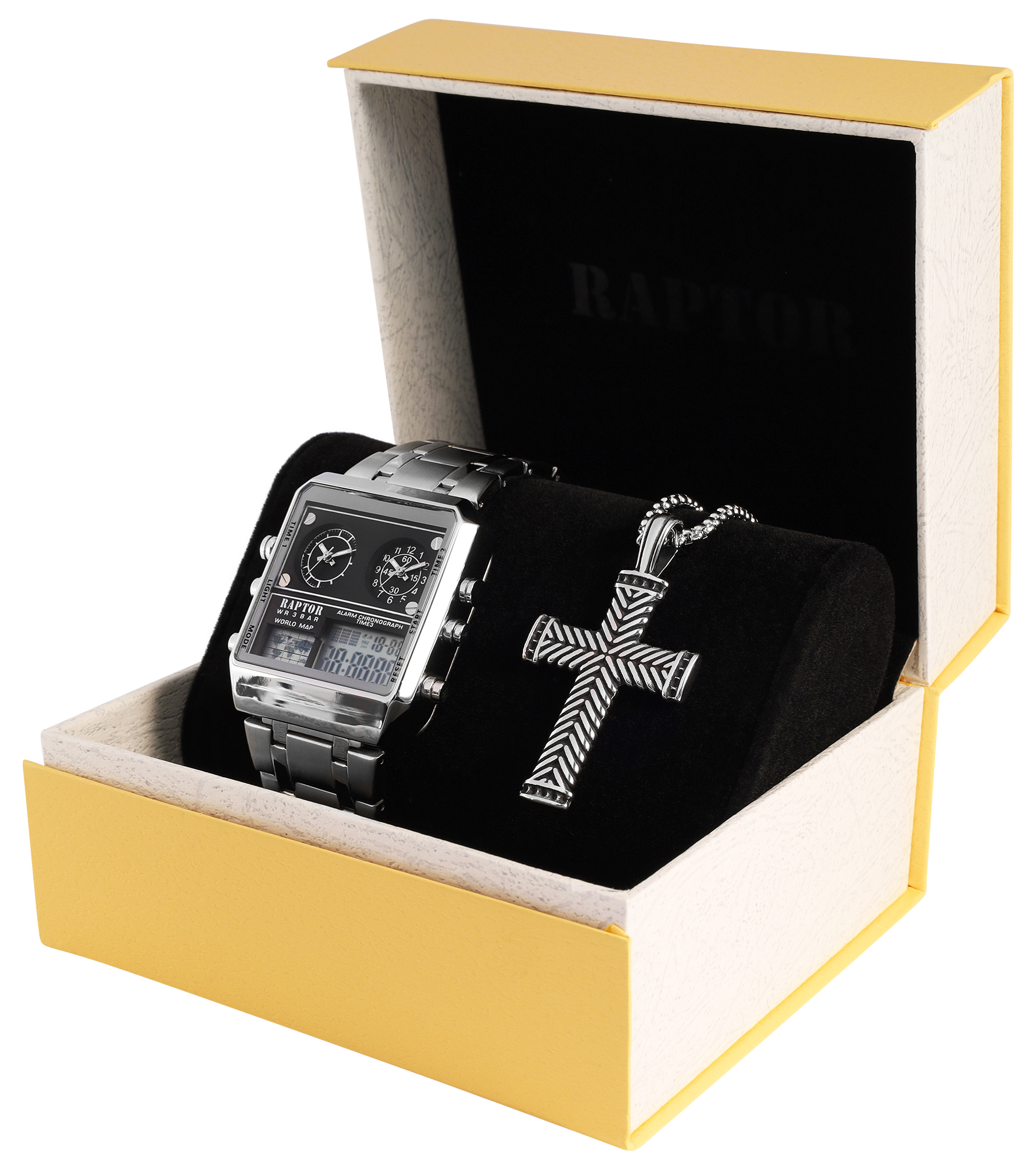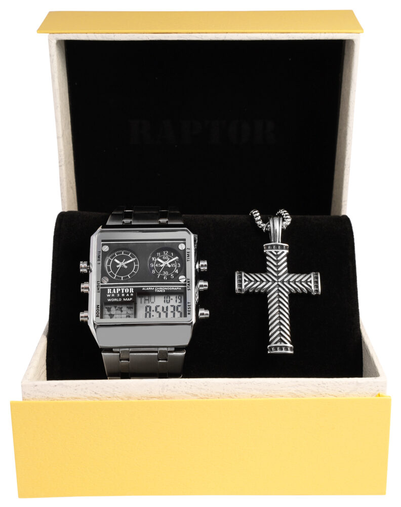 Conjunto Raptor para Homens oferece a combinação perfeita de um relógio marcante e um colar que harmoniza perfeitamente