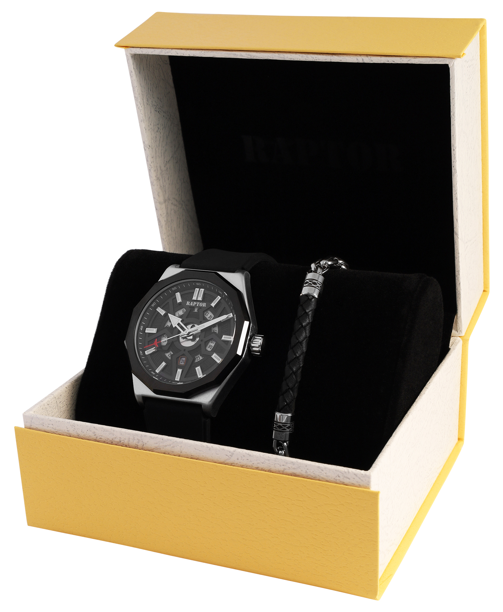 Conjunto Raptor para homem oferece a combinação ideal de um relógio elegante e uma joia.