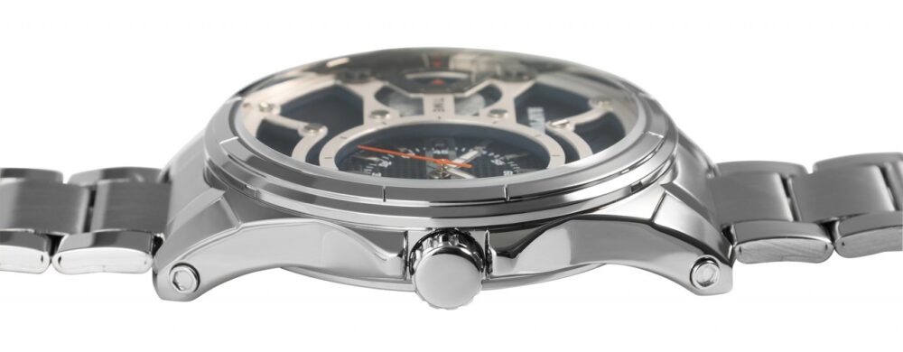 Marcante, masculino e um destaque para o homem que quer usar algo especial no seu pulso. Com uma bracelete em aço inoxidável de alta qualidade e um comprimento total de 22 cm, o relógio “Gabriel” da Raptor adapta-se perfeitamente a qualquer pulso. Medida na extremidade, a bracelete tem uma largura de 22 mm e é fixada de forma segura com um fecho dobrável clássico. Os elementos de ligação individuais podem ser removidos da bracelete em qualquer altura para personalização. O design apelativo do relógio, o mostrador impressionante e o tamanho da caixa metálica com fundo em aço inoxidável (Ø de 48 mm e uma altura de 1 mm) – tudo isto está perfeitamente harmonizado. No seu interior, dois movimentos de quartzo de alta qualidade garantem uma cronometragem exacta. O mostrador está repleto de destaques: No lado esquerdo, a hora é apresentada em discos, que indicam as horas e os minutos