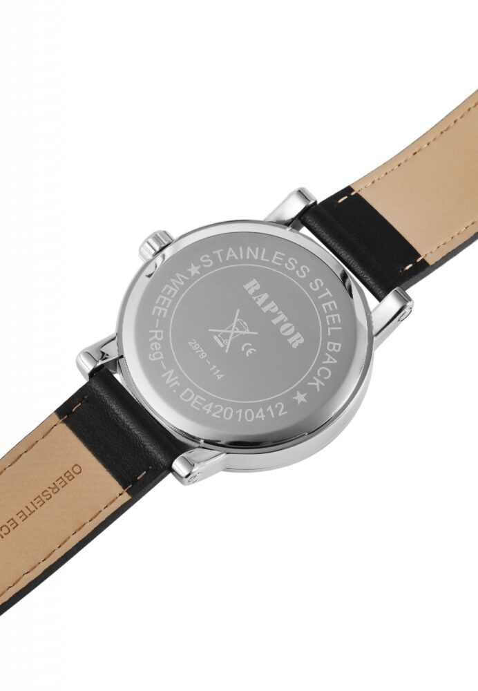 O relógio analógico masculino da marca Raptor possui um Miyota 2115. O nome do modelo é RA274. A pulseira superior em couro genuíno/parte inferior em imitação de couro tem 22 mm de largura e abre com uma fivela de pino. O comprimento total é de 24 cm. A caixa de aço inoxidável com vidro mineral tem dimensão de 46 mm e altura de caixa de 12 mm. A tampa da caixa é feita de aço inoxidável. O relógio é à prova de respingos. O relógio masculino Raptor possui os seguintes recursos: Exibição de data. Como acessórios para o seu produto você receberá: cartão de garantia, caixa original e manual do usuário.