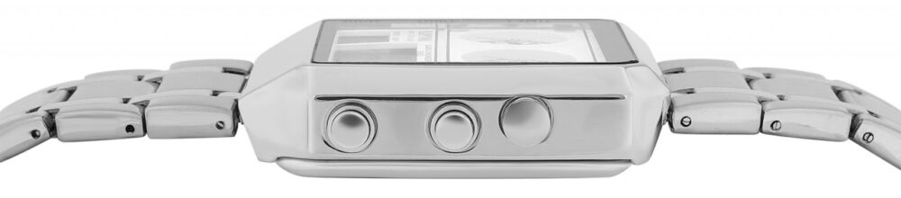 O modelo oferece três mostradores de hora: dois analógicos e um digital – perfeito para ficar de olho em vários fusos horários ao mesmo tempo.