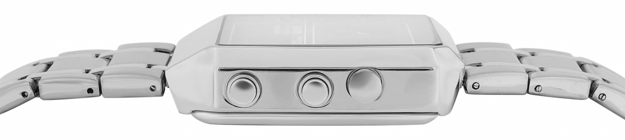 A caixa retangular mede 47 x 40 x 12,5 mm e tem um design claro. A robusta pulseira de elos de aço inoxidável (30 mm de largura na haste, cônica) com fecho dobrável clássico garante um uso confortável e uma fixação segura.