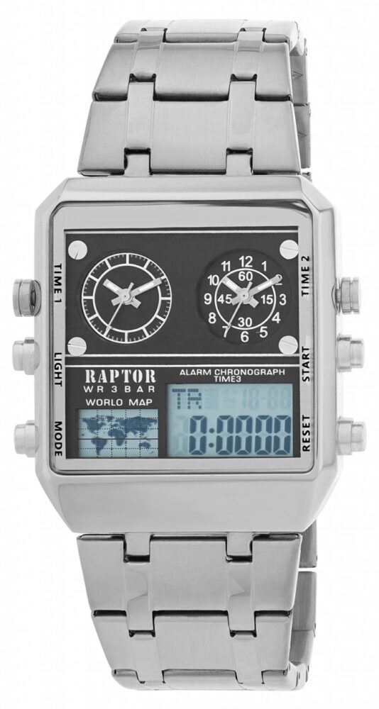 O modelo oferece três mostradores de hora: dois analógicos e um digital – perfeito para ficar de olho em vários fusos horários ao mesmo tempo.