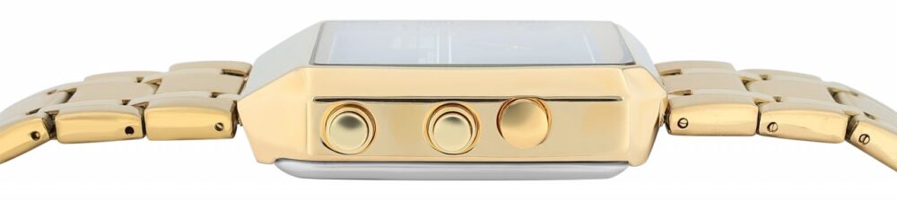 O modelo oferece três mostradores de hora: dois analógicos e um digital – perfeito para ficar de olho em vários fusos horários ao mesmo tempo.