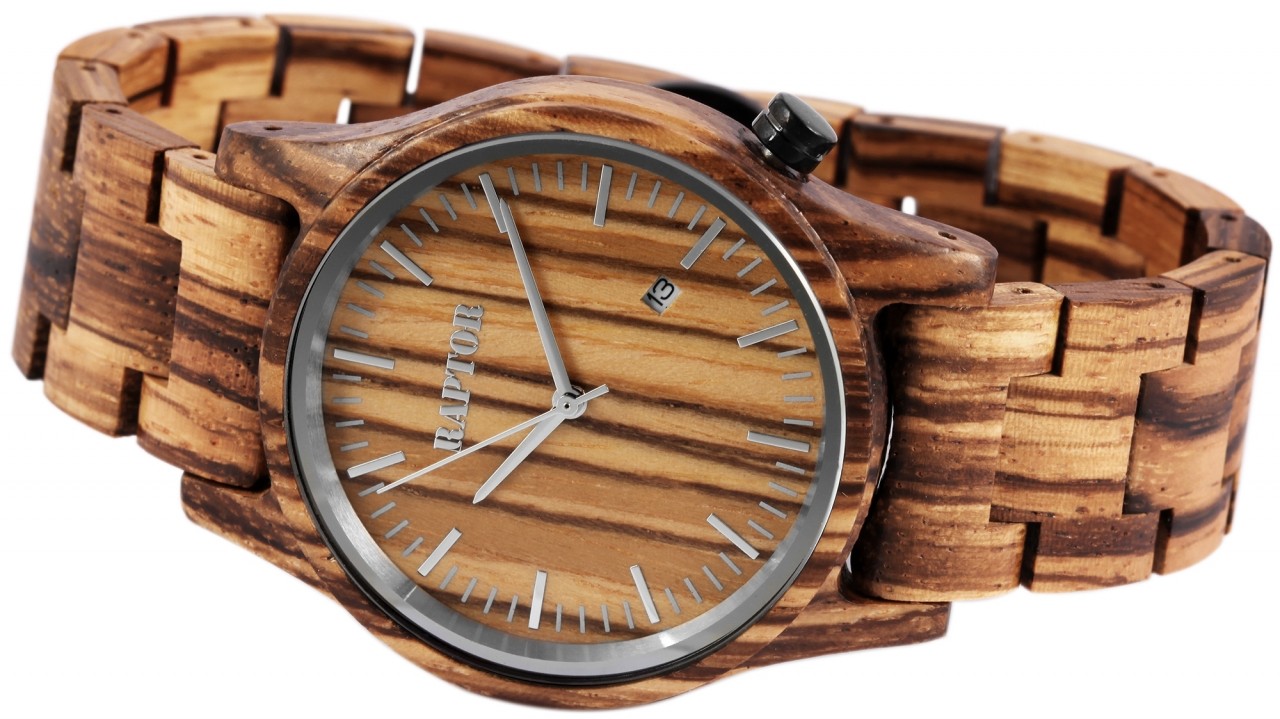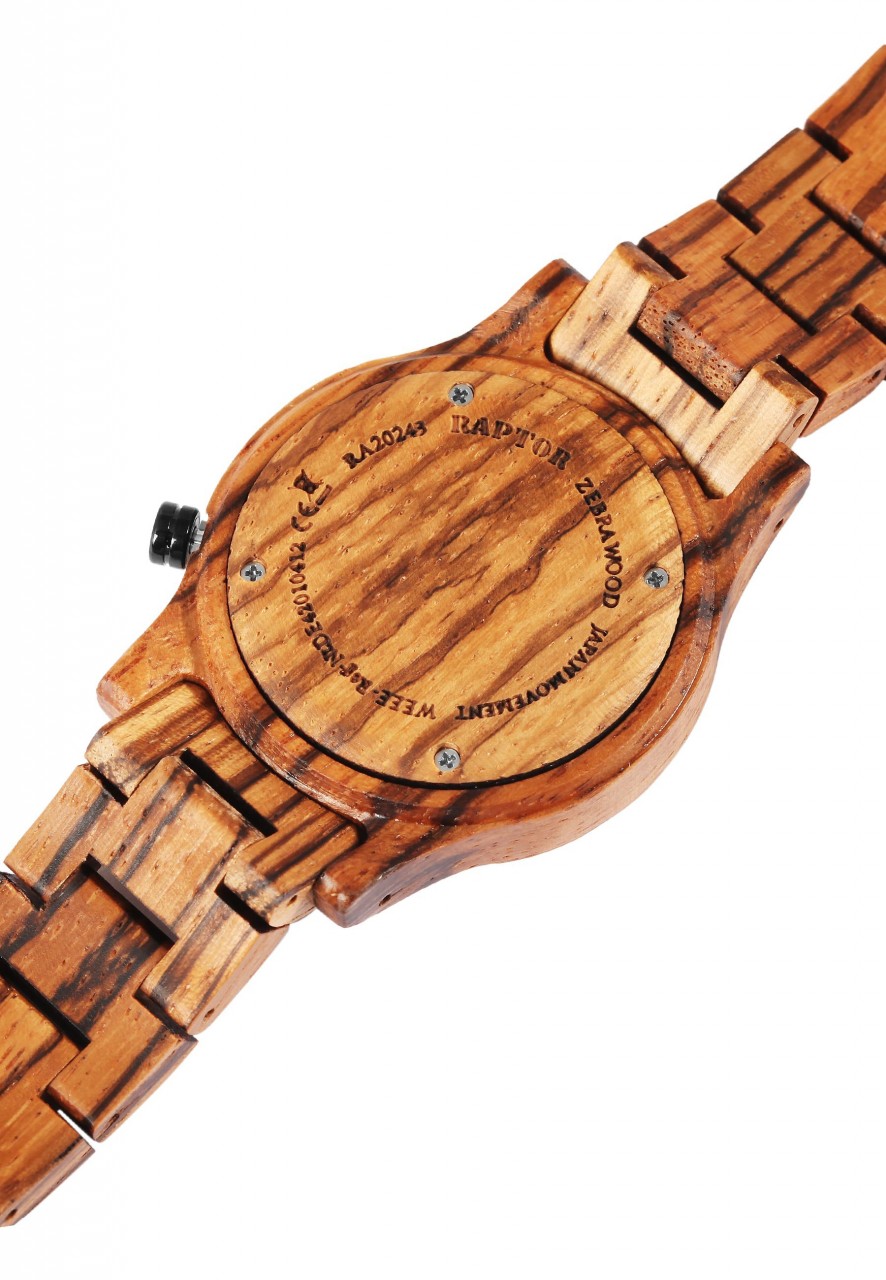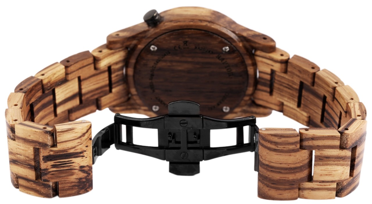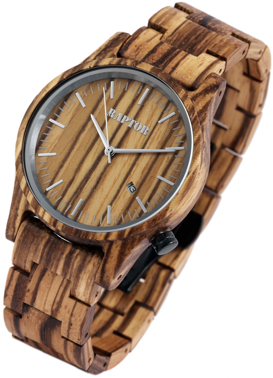 O relógio de pulso analógico de 3 ponteiros para homem da marca Raptor possui um movimento de quartzo Miyota 2115 de alta qualidade. A bracelete de madeira tem 20 mm de largura na extremidade e pode ser aberta e fechada com um fecho de borboleta em aço inoxidável. O comprimento total do relógio é de 22,5 cm. A caixa de madeira com vidro mineral tem um diâmetro de 41 mm e uma altura de 11 mm. O fundo da caixa também é feito de madeira. Existe uma janela de data às “4 horas”. O relógio de madeira Raptor é um verdadeiro chamariz no seu pulso. Pode combiná-lo com qualquer ocasião e, como o material é muito leve, o relógio pode ser ajustado de forma óptima ao seu pulso e é também muito confortável de usar. É um presente ideal para um aniversário, Natal ou Dia dos Namorados. Receberá também um cartão de garantia e uma caixa original Raptor.