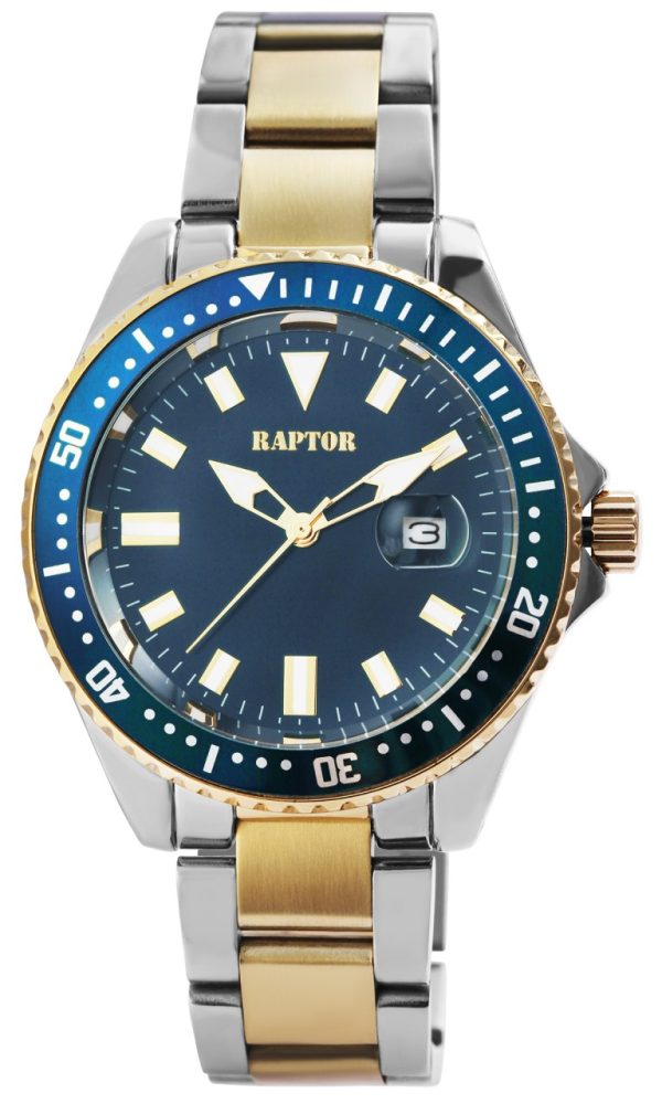O relógio de pulso analógico masculino de 3 ponteiros da marca Raptor possui um movimento de quartzo de alta qualidade. A pulseira de elos de aço inoxidável tem 20 mm de largura nas alças e pode ser aberta e fechada com um fecho dobrável de aço inoxidável. O comprimento total do relógio é de 22 cm. A caixa de metal com vidro mineral tem um diâmetro de 43 mm e uma altura de 11 mm. O relógio também possui display de data às três horas, que também vem equipado com uma lupa no vidro. O fundo da caixa é feito de aço inoxidável e o relógio masculino é resistente à água até 3 bar. Os ponteiros e índices revestidos com Superluminova facilitam a leitura das horas, mesmo no escuro. Outro destaque deste relógio é a luneta giratória, que acrescenta detalhes de moda ao modelo.