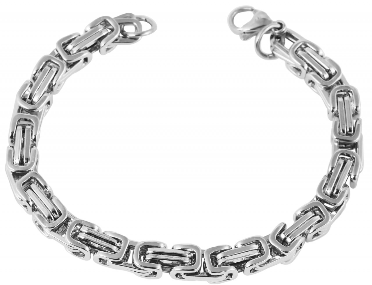 A pulseira de corrente bizantina prateada da marca Raptor é feita de aço inoxidável. Está disponível nos comprimentos de 19 cm, 20 cm e 22 cm e tem espessura de 6 mm. A pulseira moderna pode ser aberta e fechada com um mosquetão prateado, que também é feito de aço inoxidável. As correntes e pulseiras bizantinas são conhecidas por seu design masculino e sólido. Destacam-se pelos inúmeros elementos que se interligam de forma especial e completam qualquer look forte. A pulseira pode ser combinada particularmente bem com a corrente real correspondente. Também é ideal como presente, por exemplo, para um aniversário.