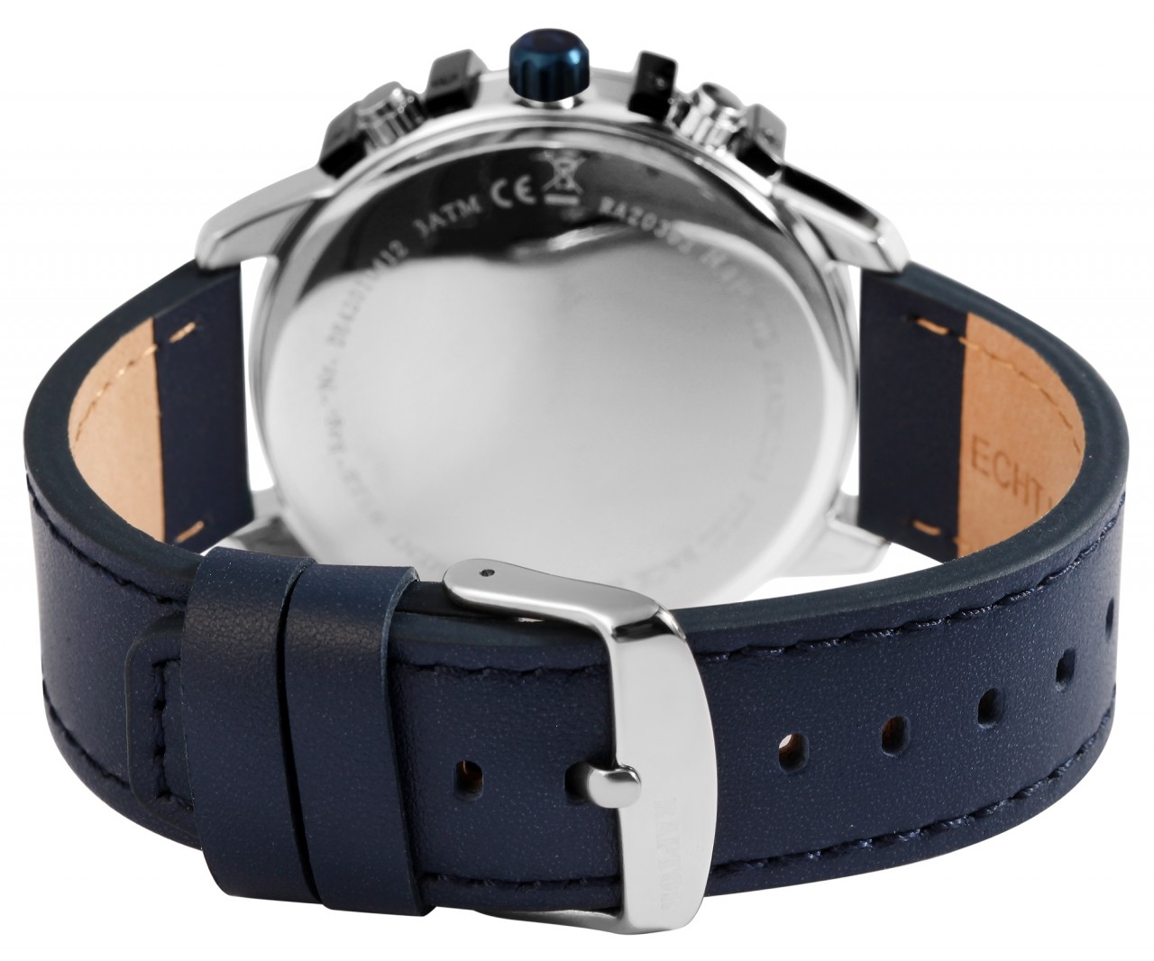 O relógio multifuncional de 3 ponteiros da marca Raptor “Arve” possui o movimento de quartzo Miyota JP15 de alta qualidade. A pulseira de couro genuíno tem 22 mm de largura na alça e pode ser aberta e fechada com uma fivela. O comprimento total do relógio é de 26 cm. A caixa redonda de metal com vidro mineral tem um diâmetro de 48 mm e uma altura de 12 mm. O vidro mineral muda ligeiramente de cor dependendo da influência da luz e do reflexo, tornando-o um grande atrativo em um relógio de pulso masculino. O fundo da caixa é feito de aço inoxidável e o relógio tem resistência à água de 3 ATM. O mostrador impressiona pelo seu design desportivo e layout claro. O relógio também possui dois fusos horários, uma exibição de data e uma exibição de 24 horas.