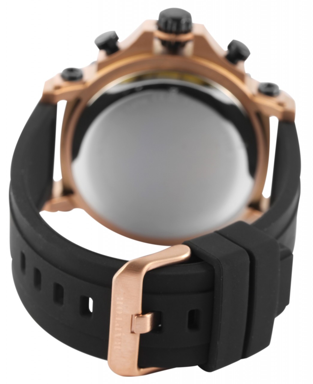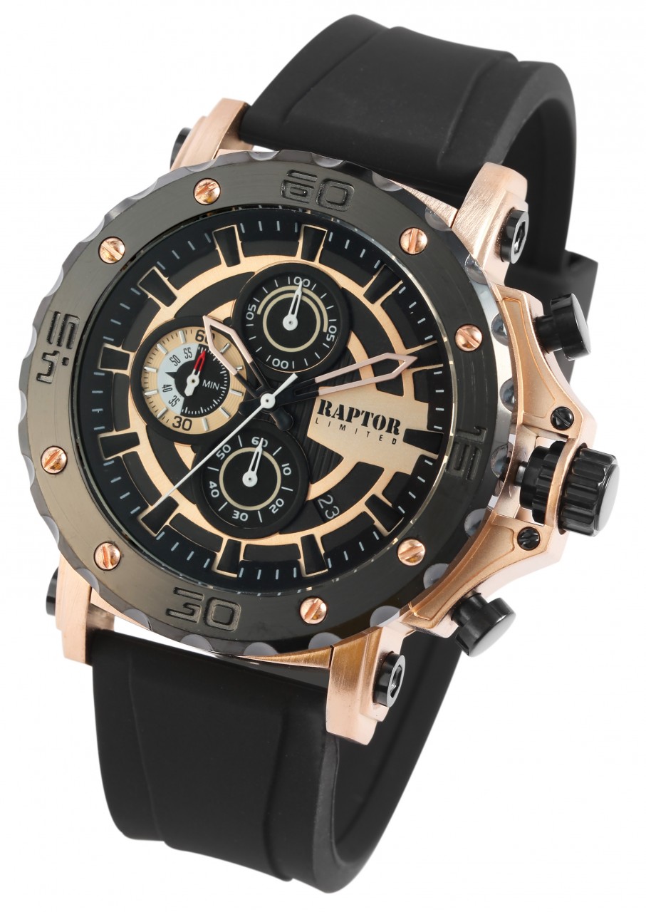 O relógio masculino da marca Raptor "Raman" possui movimento de quartzo de alta qualidade. A pulseira de silicone tem 22 mm de largura na alça e pode ser aberta e fechada com uma fivela. O comprimento total do relógio é de 26,5 cm. A caixa de metal com vidro mineral tem um diâmetro de 48 mm e uma altura de 12,5 mm. O fundo da caixa é feito de aço inoxidável. O tempo pode ser parado com o cronógrafo e depois lido nos três totalizadores às seis, nove e doze horas. O relógio também possui uma exibição de data entre quatro e cinco horas. Além disso, o relógio masculino tem resistência à água de 3 ATM.…