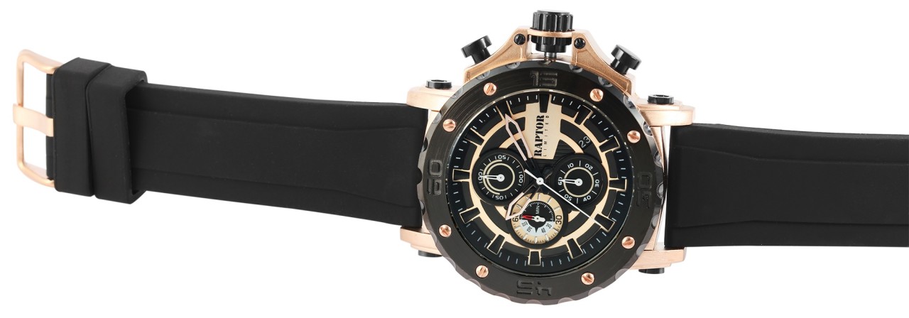 O relógio masculino da marca Raptor “Raman” possui movimento de quartzo de alta qualidade. A pulseira de silicone tem 22 mm de largura na alça e pode ser aberta e fechada com uma fivela. O comprimento total do relógio é de 26,5 cm. A caixa de metal com vidro mineral tem um diâmetro de 48 mm e uma altura de 12,5 mm. O fundo da caixa é feito de aço inoxidável. O tempo pode ser parado com o cronógrafo e depois lido nos três totalizadores às seis, nove e doze horas. O relógio também possui uma exibição de data entre quatro e cinco horas. Além disso, o relógio masculino tem resistência à água de 3 ATM. No geral, este relógio é um cronômetro desportivo e um ótimo companheiro para a vida cotidiana.