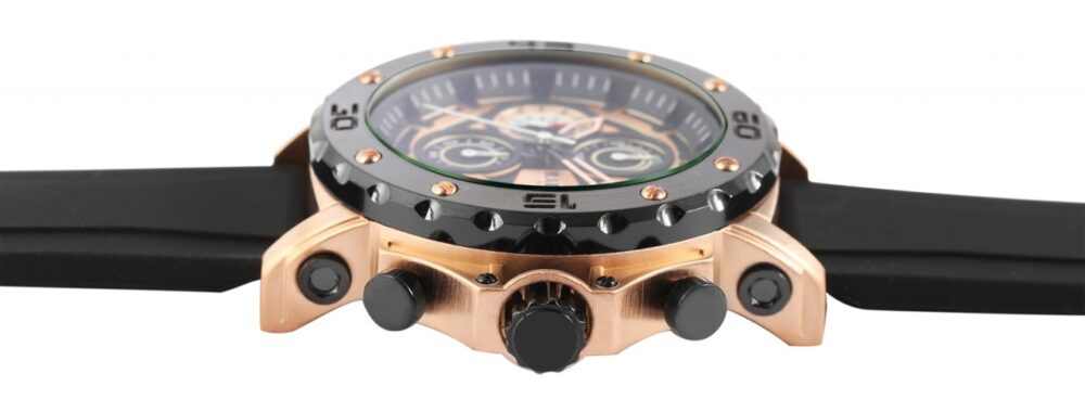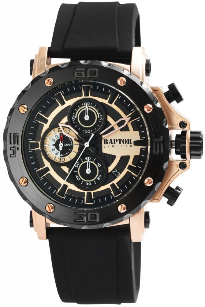 O relógio masculino da marca Raptor "Raman" possui movimento de quartzo de alta qualidade. A pulseira de silicone tem 22 mm de largura na alça e pode ser aberta e fechada com uma fivela. O comprimento total do relógio é de 26,5 cm. A caixa de metal com vidro mineral tem um diâmetro de 48 mm e uma altura de 12,5 mm. O fundo da caixa é feito de aço inoxidável. O tempo pode ser parado com o cronógrafo e depois lido nos três totalizadores às seis, nove e doze horas. O relógio também possui uma exibição de data entre quatro e cinco horas. Além disso, o relógio masculino tem resistência à água de 3 ATM.…