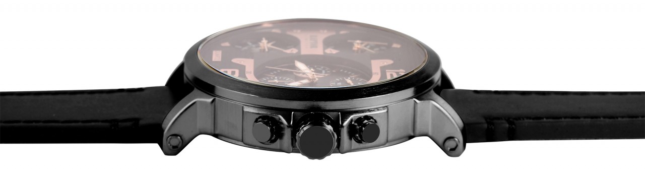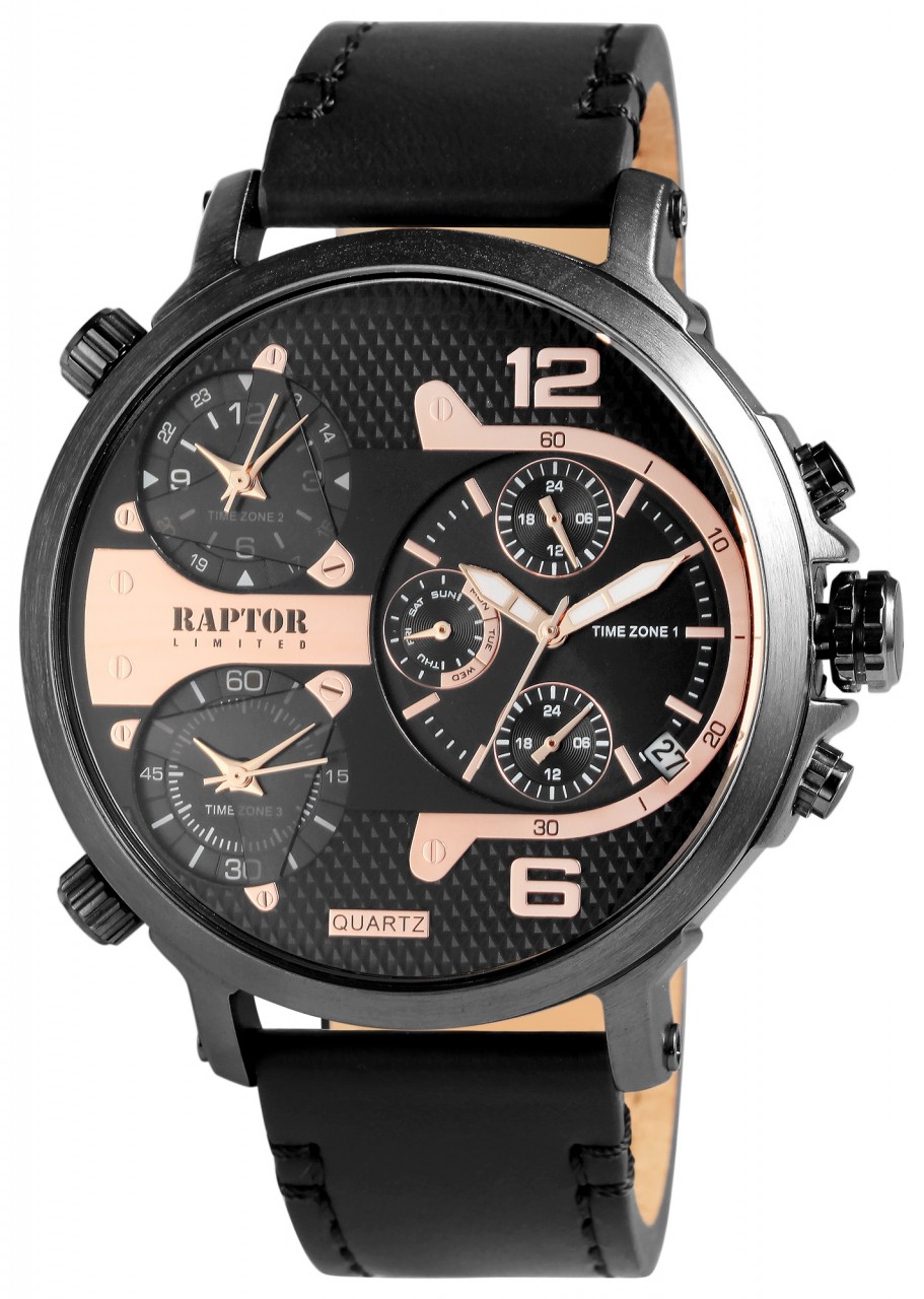 O relógio de pulso multifunções para homem da marca Raptor possui 3 movimentos de quartzo de alta qualidade. O Miyota JP15 é utilizado para o 1º fuso horário, o que significa que, para além da indicação normal de 12 horas, uma indicação paralela de 24 horas (indicação descentralizada superior), uma indicação da data (entre as 4 e as 5 horas), uma indicação do dia (indicação descentralizada esquerda) e uma outra indicação separada de 24 horas (indicação descentralizada inferior) adornam o mostrador. Um Miyota 2035 foi utilizado para cada um dos 2º e 3º fusos horários, resultando em dois mostradores adicionais de 12 horas. O relógio está igualmente equipado com uma bracelete em pele genuína com pespontos. Esta bracelete tem 24 mm de largura na extremidade, desce para 21 mm e pode ser aberta e fechada com uma fivela em aço inoxidável preto. O relógio tem um comprimento total de 26 cm. A caixa em metal preto está equipada com um vidro mineral.