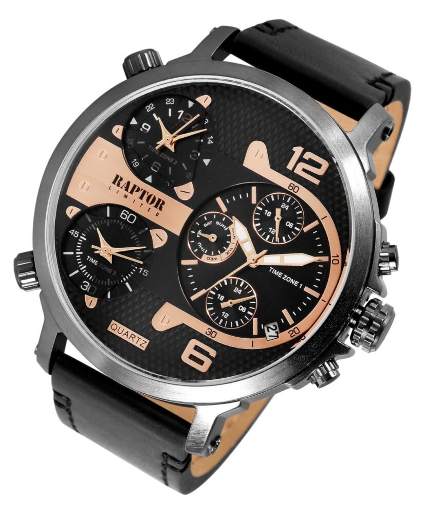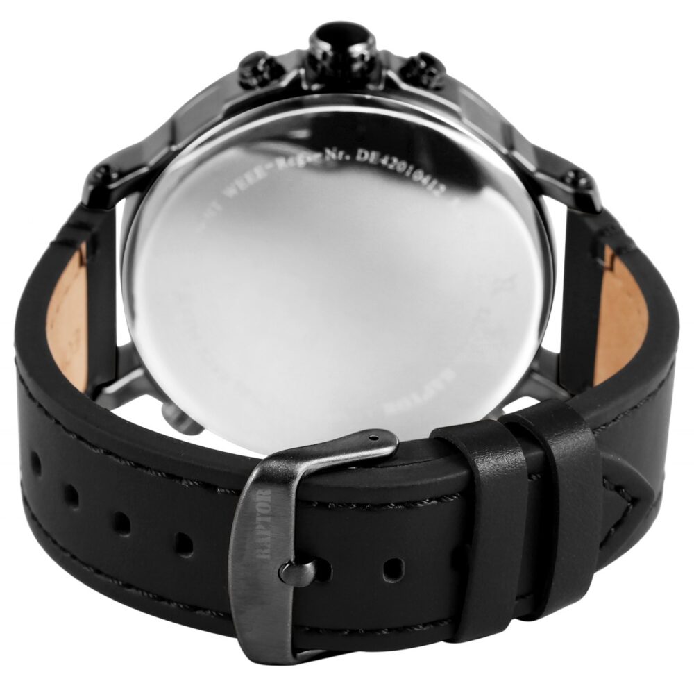 O relógio de pulso multifunções para homem da marca Raptor possui 3 movimentos de quartzo de alta qualidade. O Miyota JP15 é utilizado para o 1º fuso horário, o que significa que, para além da indicação normal de 12 horas, uma indicação paralela de 24 horas (indicação descentralizada superior), uma indicação da data (entre as 4 e as 5 horas), uma indicação do dia (indicação descentralizada esquerda) e uma outra indicação separada de 24 horas (indicação descentralizada inferior) adornam o mostrador. Um Miyota 2035 foi utilizado para cada um dos 2º e 3º fusos horários, resultando em dois mostradores adicionais de 12 horas. O relógio está igualmente equipado com uma bracelete em pele genuína com pespontos. Esta bracelete tem 24 mm de largura na extremidade, desce para 21 mm e pode ser aberta e fechada com uma fivela em aço inoxidável preto. O relógio tem um comprimento total de 26 cm. A caixa em metal preto está equipada com um vidro mineral.