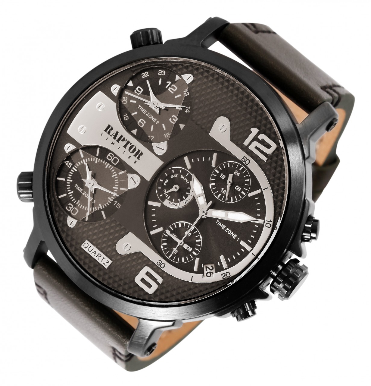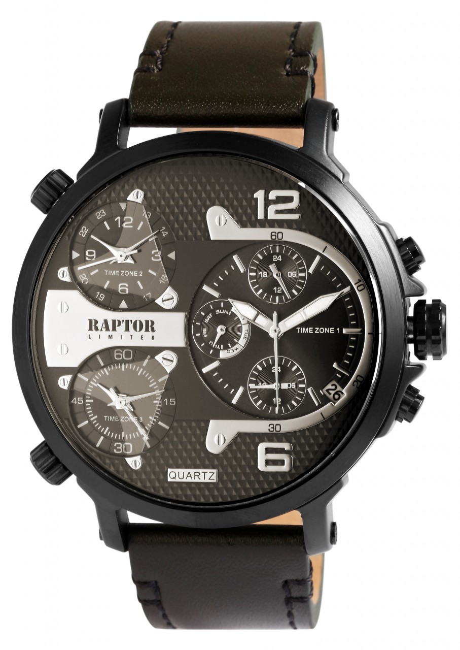 O relógio de pulso multifunções para homem da marca Raptor possui 3 movimentos de quartzo de alta qualidade. O Miyota JP15 é utilizado para o 1º fuso horário, o que significa que, para além da indicação normal de 12 horas, uma indicação paralela de 24 horas (indicação descentralizada superior), uma indicação da data (entre as 4 e as 5 horas), uma indicação do dia (indicação descentralizada esquerda) e uma outra indicação separada de 24 horas (indicação descentralizada inferior) adornam o mostrador. Um Miyota 2035 foi utilizado para cada um dos 2º e 3º fusos horários, resultando em dois mostradores adicionais de 12 horas. O relógio está igualmente equipado com uma bracelete em pele genuína com pespontos. Esta bracelete tem 24 mm de largura na extremidade, desce para 21 mm e pode ser aberta e fechada com uma fivela em aço inoxidável preto. O relógio tem um comprimento total de 26 cm. A caixa em metal preto está equipada com um vidro mineral.