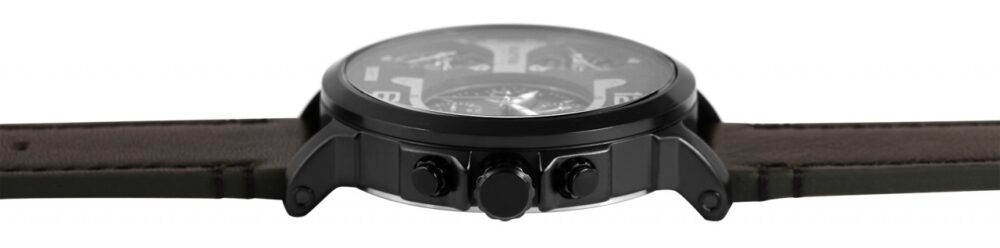 O relógio de pulso multifunções para homem da marca Raptor possui 3 movimentos de quartzo de alta qualidade. O Miyota JP15 é utilizado para o 1º fuso horário, o que significa que, para além da indicação normal de 12 horas, uma indicação paralela de 24 horas (indicação descentralizada superior), uma indicação da data (entre as 4 e as 5 horas), uma indicação do dia (indicação descentralizada esquerda) e uma outra indicação separada de 24 horas (indicação descentralizada inferior) adornam o mostrador. Um Miyota 2035 foi utilizado para cada um dos 2º e 3º fusos horários, resultando em dois mostradores adicionais de 12 horas. O relógio está igualmente equipado com uma bracelete em pele genuína com pespontos. Esta bracelete tem 24 mm de largura na extremidade, desce para 21 mm e pode ser aberta e fechada com uma fivela em aço inoxidável preto. O relógio tem um comprimento total de 26 cm. A caixa em metal preto está equipada com um vidro mineral.