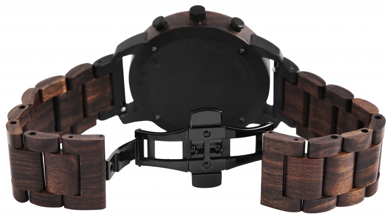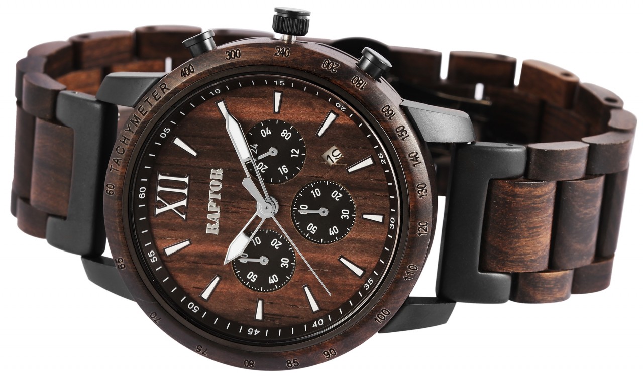 O cronógrafo masculino da marca Raptor possui o movimento de quartzo Japão VD53 de alta qualidade. A pulseira de madeira está ligada à caixa em ambos os lados por um elemento de aço inoxidável. Tem 22 mm de largura na alça e pode ser aberto e fechado com um fecho borboleta de aço inoxidável preto. O comprimento total do relógio é de 22,5 cm. A base da caixa é de metal, o restante é de madeira. A caixa contém um vidro mineral e tem um diâmetro de 45 mm e uma altura de 11 mm. O mostrador também é feito de madeira e possui totalizadores pretos e marcadores de horas brancos. O tempo pode ser parado através do cronógrafo, que pode então ser lido nos totalizadores às seis e nove horas. O relógio também possui uma exibição de 24 horas às três horas e uma exibição de data entre quatro e cinco horas.