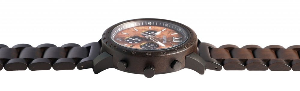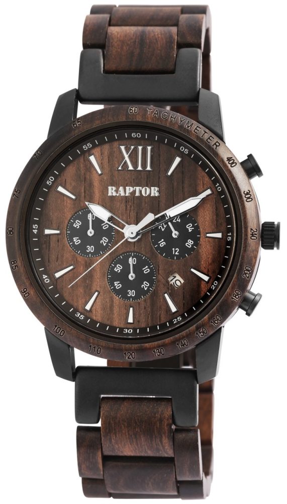 O cronógrafo masculino da marca Raptor possui o movimento de quartzo Japão VD53 de alta qualidade. A pulseira de madeira está ligada à caixa em ambos os lados por um elemento de aço inoxidável. Tem 22 mm de largura na alça e pode ser aberto e fechado com um fecho borboleta de aço inoxidável preto. O comprimento total do relógio é de 22,5 cm. A base da caixa é de metal, o restante é de madeira. A caixa contém um vidro mineral e tem um diâmetro de 45 mm e uma altura de 11 mm. O mostrador também é feito de madeira e possui totalizadores pretos e marcadores de horas brancos. O tempo pode ser parado através do cronógrafo, que pode então ser lido nos totalizadores às seis e nove horas. O relógio também possui uma exibição de 24 horas às três horas e uma exibição de data entre quatro e cinco horas.