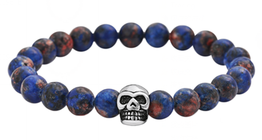 A pulseira bola da marca Raptor é feita de cinco pedras naturais de cores diferentes. Está disponível nas pedras azul lazulita, olho de tigre, obsidiana floco de neve, ágata preta e olho de tigre marrom. Além disso, um pingente de caveira em aço inoxidável está incorporado em cada pulseira. A pulseira de joalheria especial tem comprimento total de 20,5 cm e é amarrada em um fio de náilon transparente e levemente elástico. Isso significa que pode ser colocado de maneira fácil e confortável no pulso. As bolas têm diâmetro de 8,5 mm e o elemento do crânio tem altura de 14 mm. Cada pedra natural tem algo especial e adapta-se a cada look devido ao jogo de cores de cada pedra.