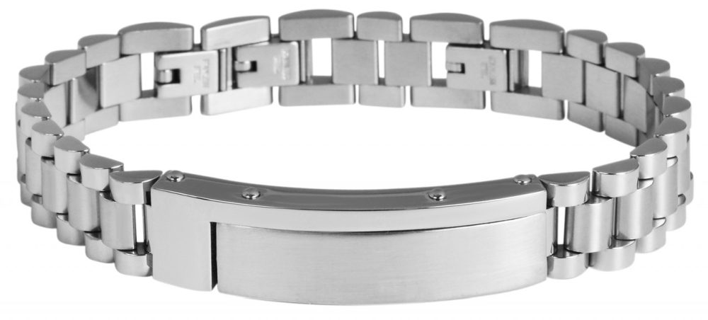 A pulseira gravada da marca Raptor é fabricada em aço inoxidável e pode ser fechada com um fecho de clipe, que também é fabricado em aço inoxidável. A pulseira tem 23 cm de comprimento, mas pode ser encurtada em 2 x 1 cm e 1 x 2,5 cm utilizando os elementos intermédios com fecho de clipe. A placa de gravação inserida no centro tem um comprimento de 4,5 cm, uma largura de 12 mm e uma espessura de 5 mm.